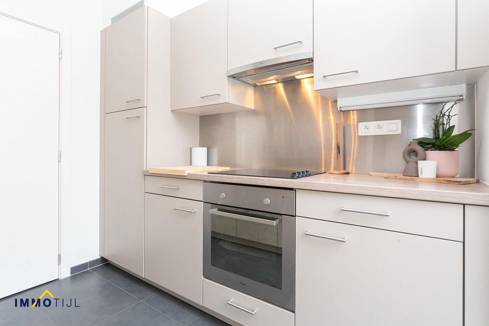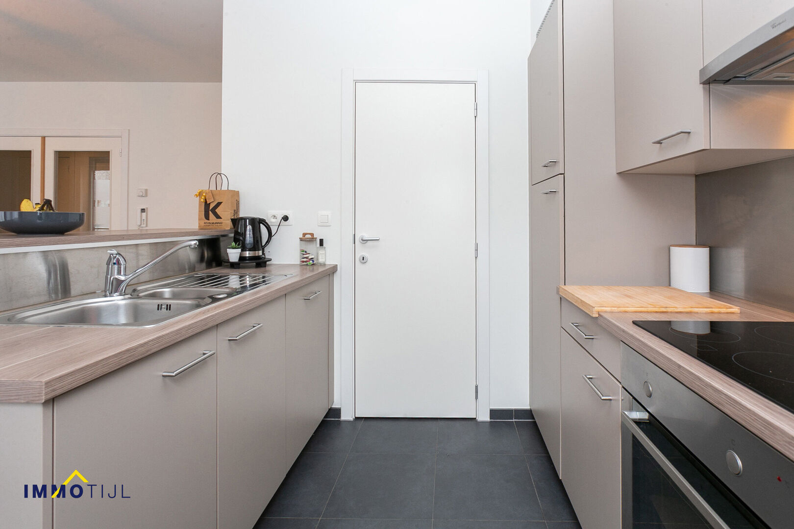 Het appartement beschikt over een ruime inkomhal die via dubbele deuren toegang geeft tot de open en lichte leefruimte met een moderne, volledig uitgeruste keuken. Aansluitend bevindt zich een praktische berging.