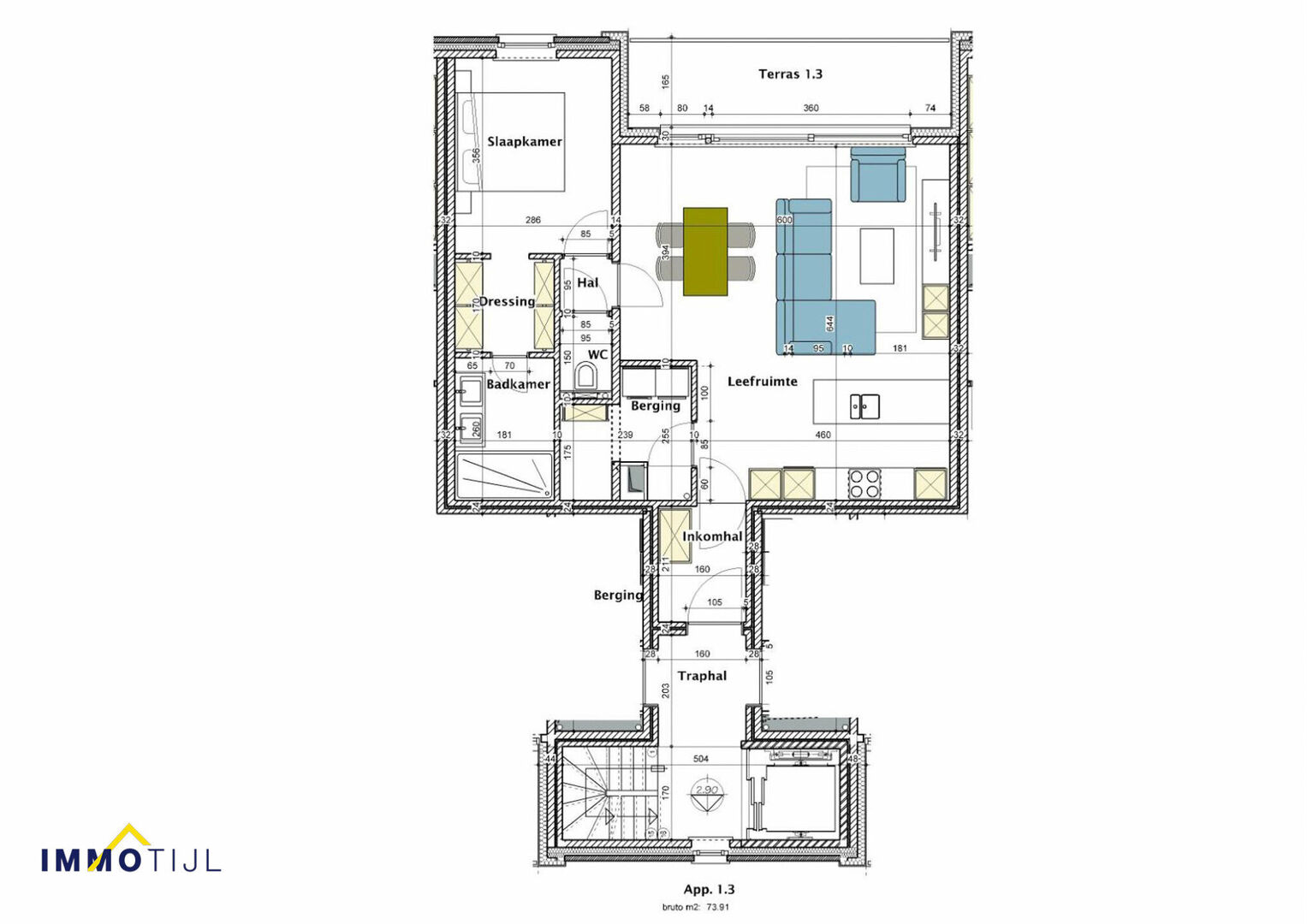 Dit appartement op de eerste verdieping – lift aanwezig - telt 1 slaapkamer en heeft een bewoonbare oppervlakte van 74m². Ruim terras van 12m².