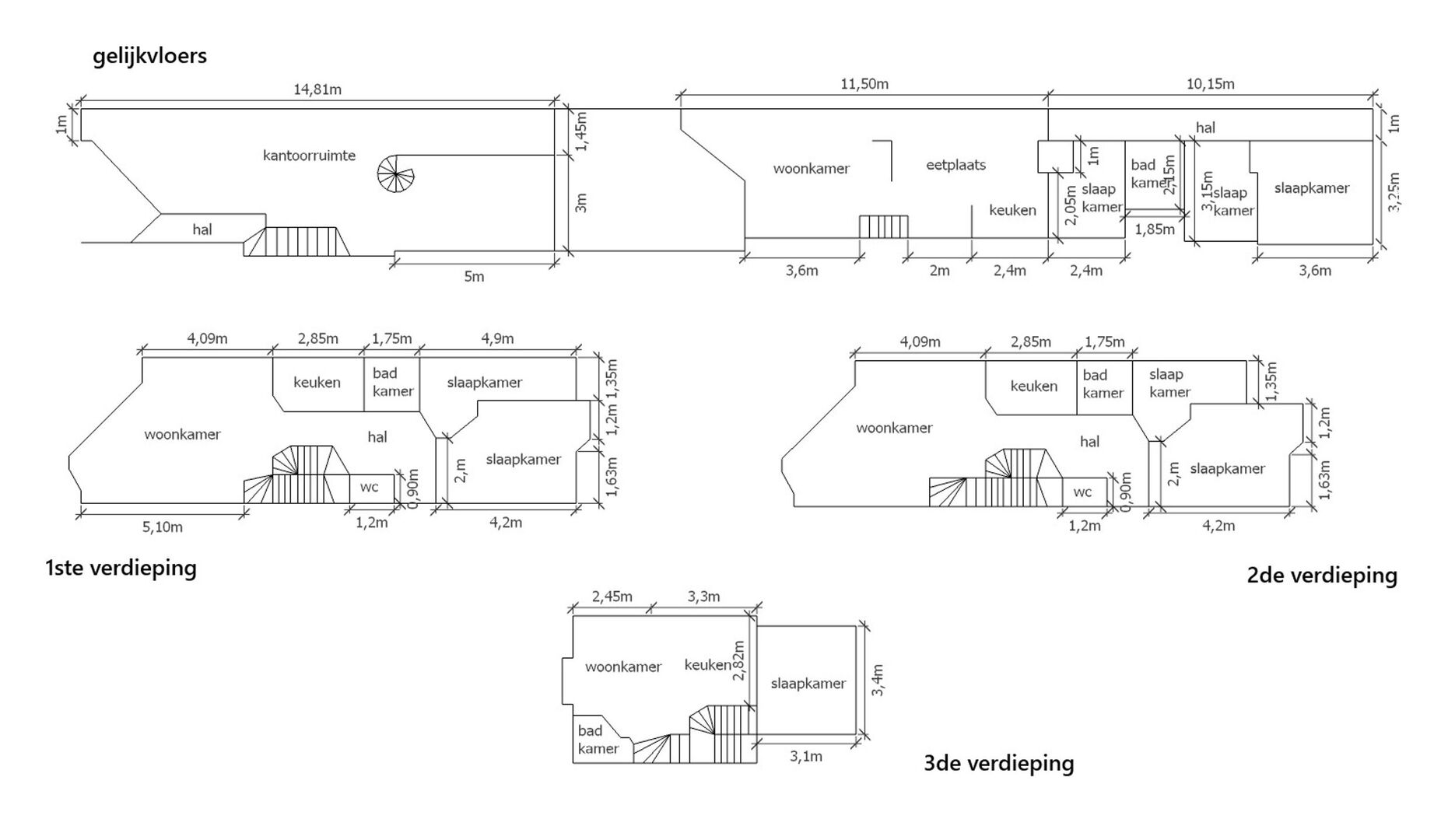 Het gelijkvloers is momenteel ingericht als kantoorruimte aan de voorzijde, met daarachter een appartement. Op de eerste en tweede verdieping bevinden zich elk een appartement, elk met een eigen terras, woonkamer, keuken, badkamer en 2 kamers. De appartementen zijn momenteel verhuurd, wat het gebouw ook aantrekkelijk maakt als opbrengsteigendom.