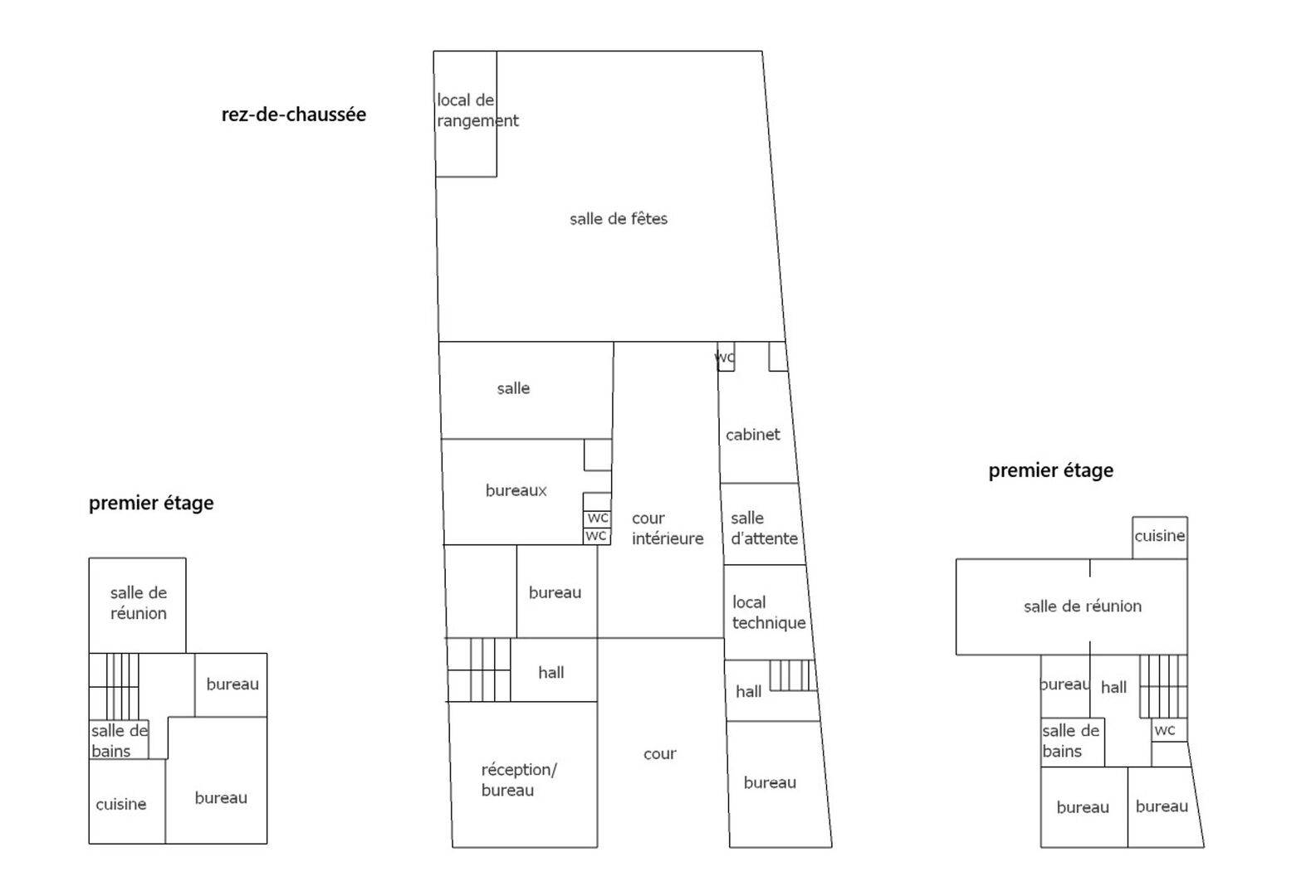 Op het gelijkvloers bevinden zich verschillende bureaus en polyvalente zalen, evenals sanitaire voorzieningen en een praktijk met wachtzaal. Via de binnenkoer heeft u vlotte toegang tot de feestzaal/polyvalente ruimte achteraan het gebouw.
