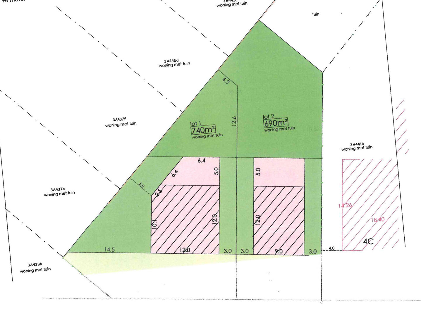 Dit mooi perceel van ongeveer 740 m² (zie plan en luchtfoto, lot 1), de straatbreedte bedraagt ongeveer 21 meter. Deze grond is gelegen in een goedgekeurde verkaveling en biedt een uitstekende kans voor het realiseren van een open bebouwing.