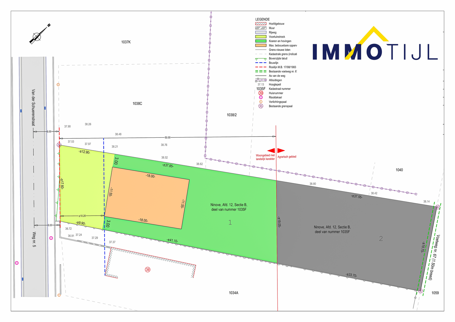 Lot 1 is gelegen in woongebied met landelijk karakter. Lot 2, gelegen in agrarisch gebied en uitgesloten uit de verkaveling, vormt een perfecte achterliggende tuinzone waar rust, privacy en groen primeren.