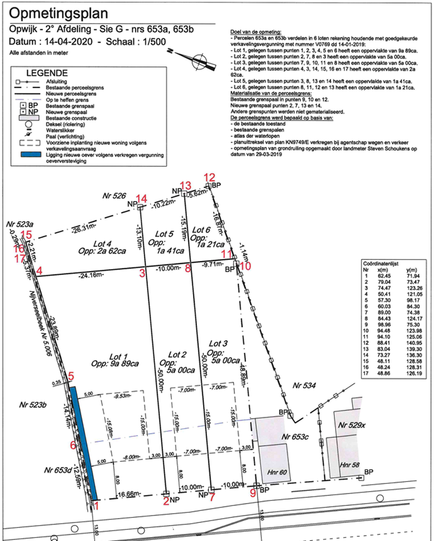 Totale oppervlakte OB: 12a51; perceeloppervlaktes van de twee halfopen percelen zijn respectievelijk 6a21 en 6a41.