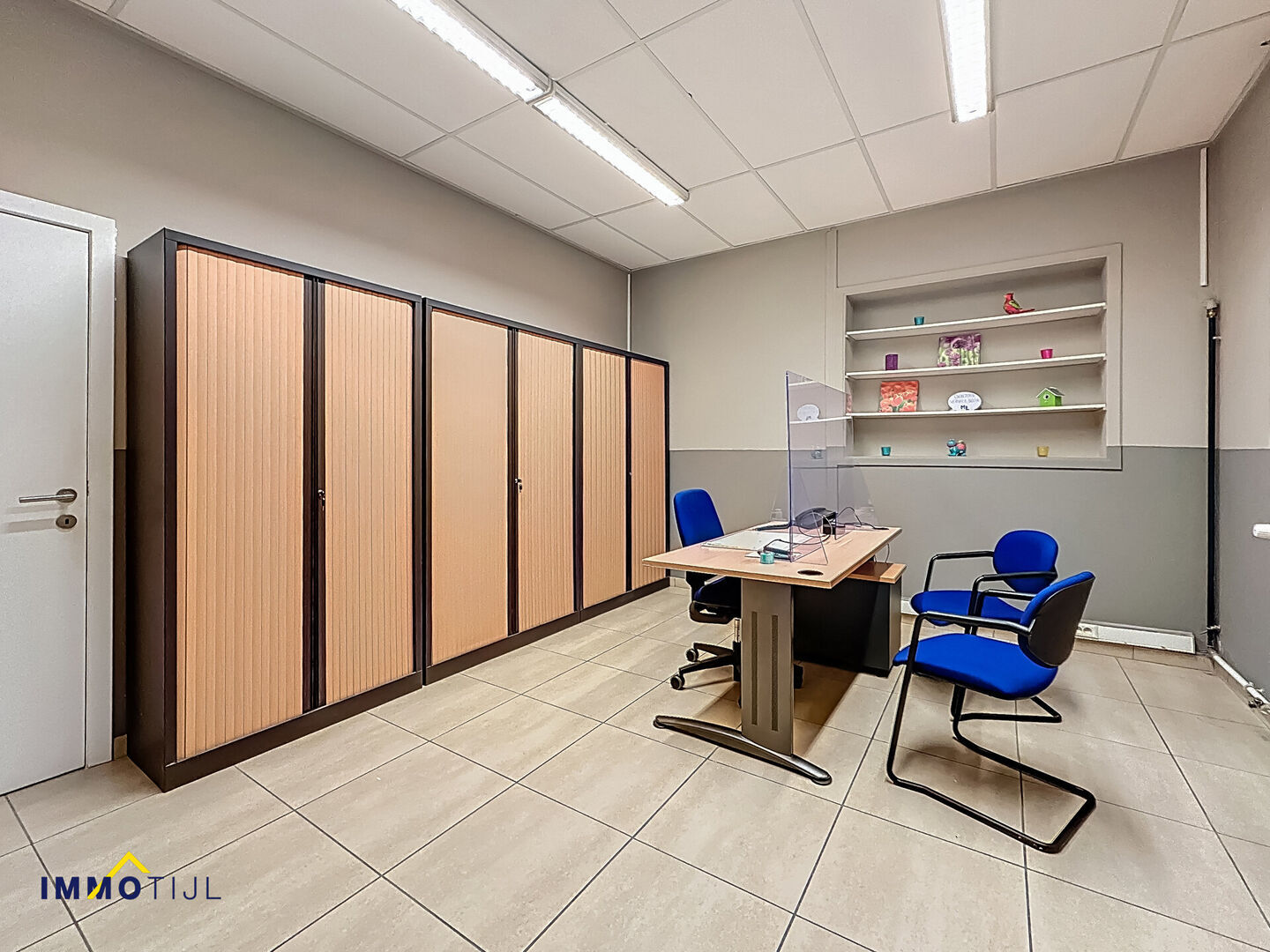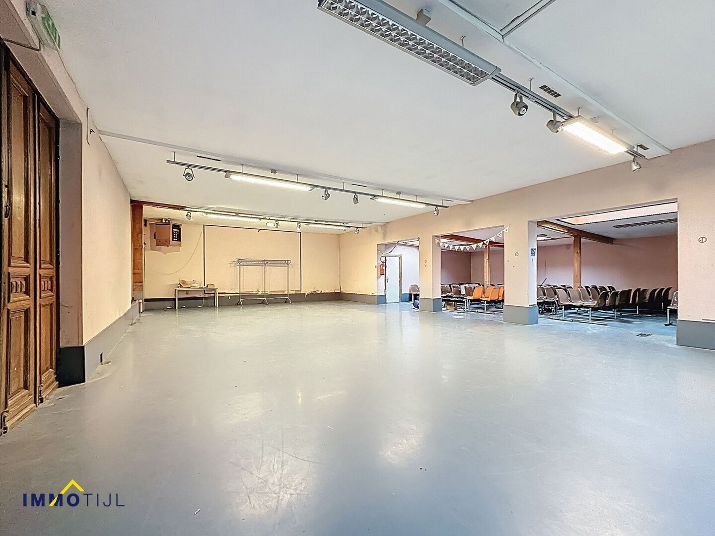 Op het gelijkvloers bevinden zich verschillende bureaus en polyvalente zalen, evenals sanitaire voorzieningen en een praktijk met wachtzaal. Via de binnenkoer heeft u vlotte toegang tot de feestzaal/polyvalente ruimte achteraan het gebouw.