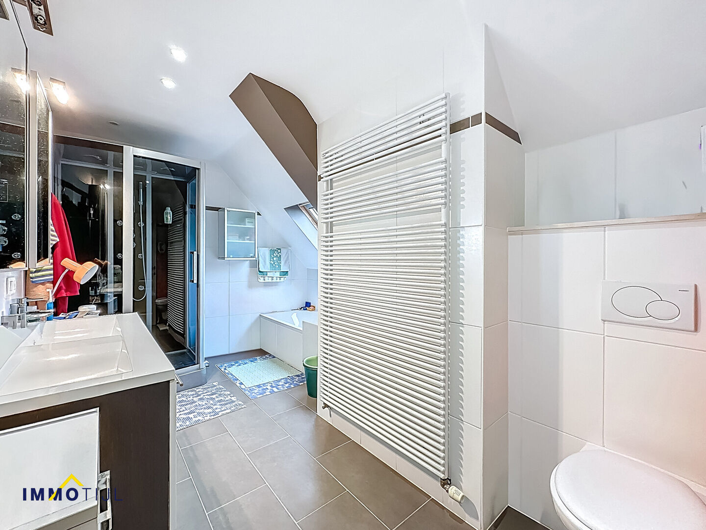 Op de bovenste verdieping bevinden zich twee volwaardige slaapkamers, waarvan één met ruimte voor een dressing (24m²). De moderne badkamer is uitgerust met een douche, bad, dubbele lavabo en toilet.