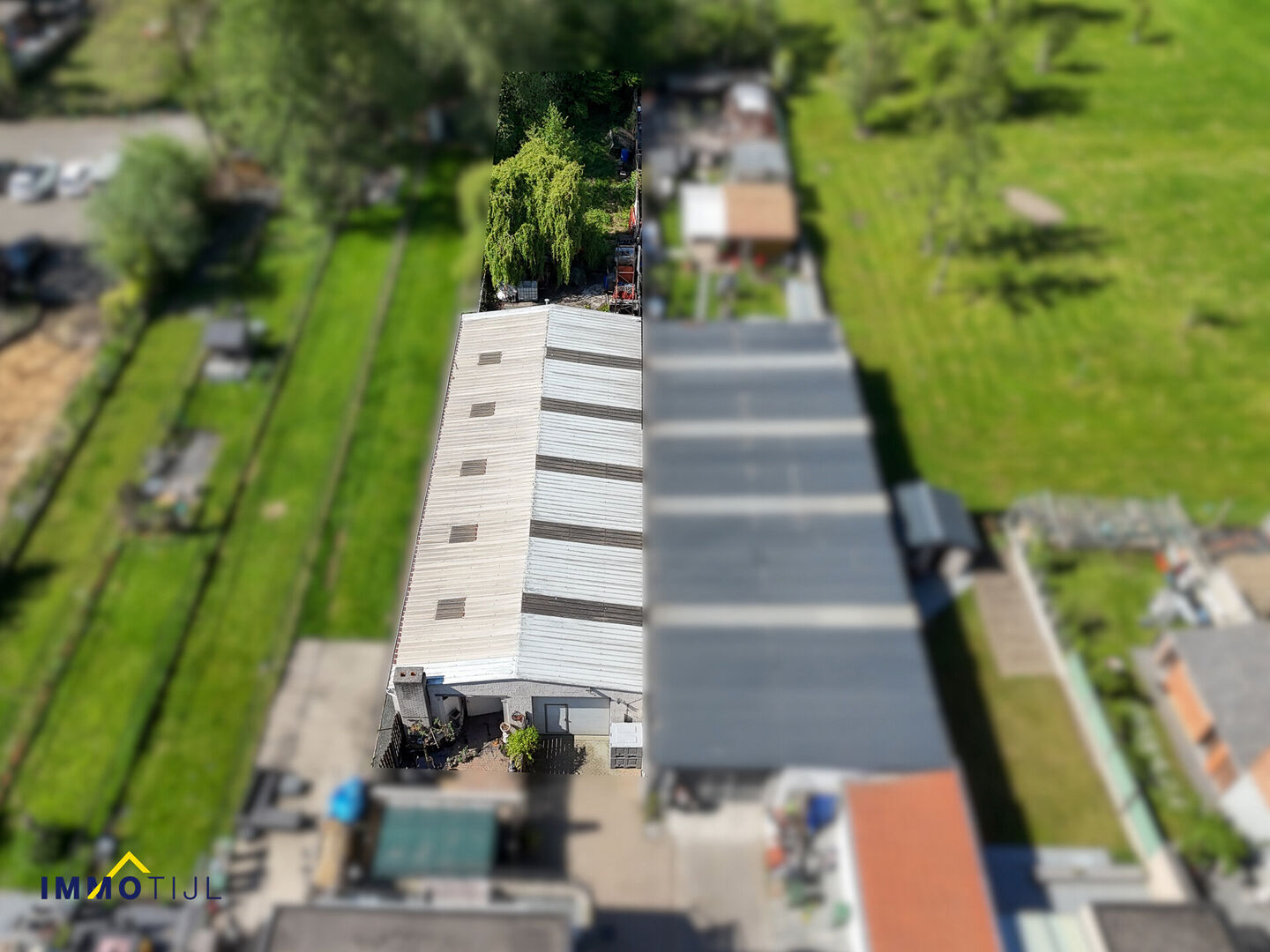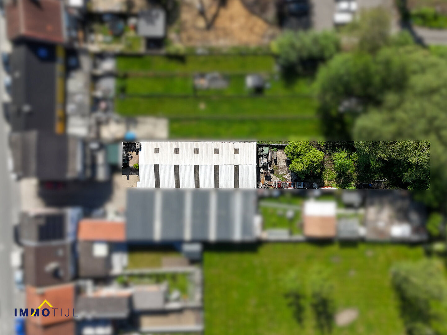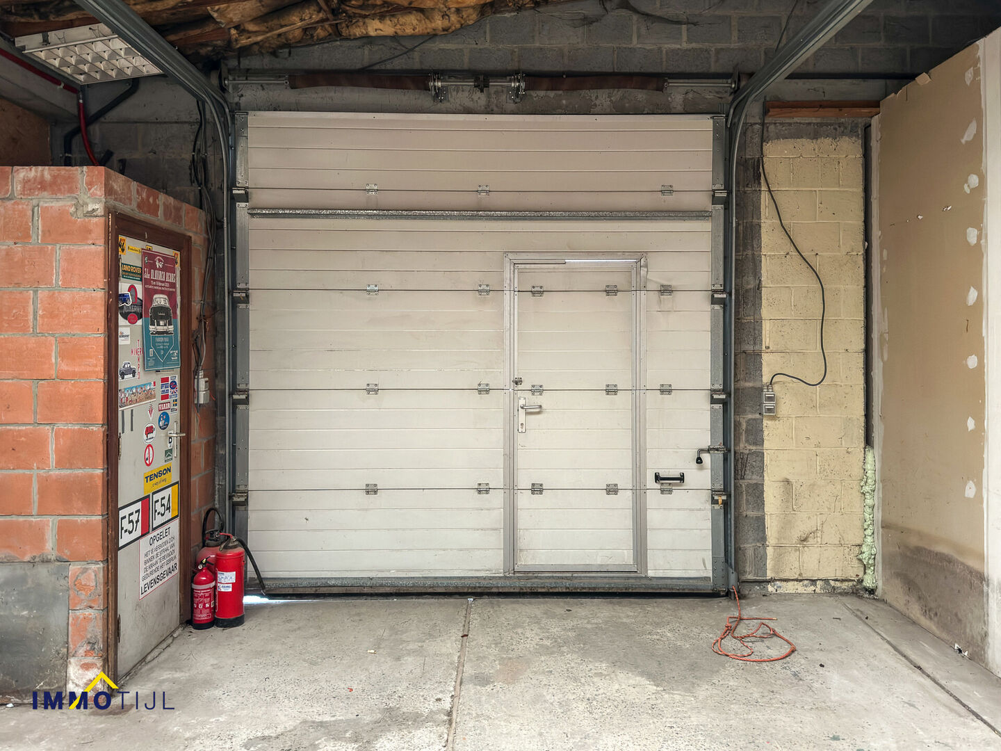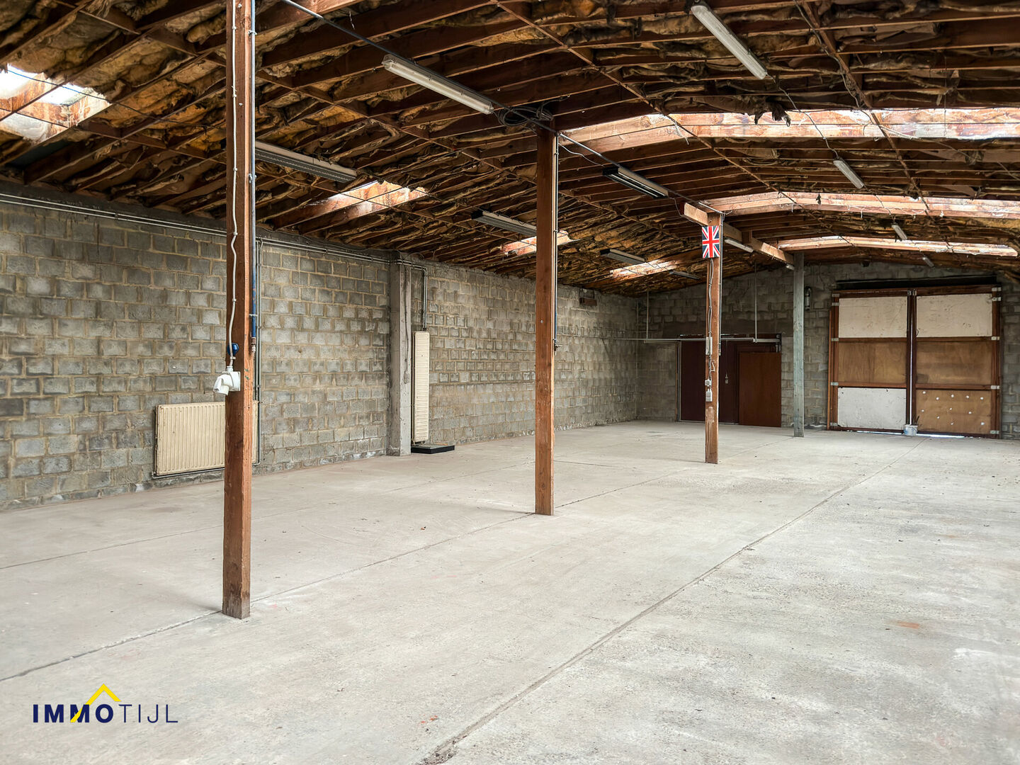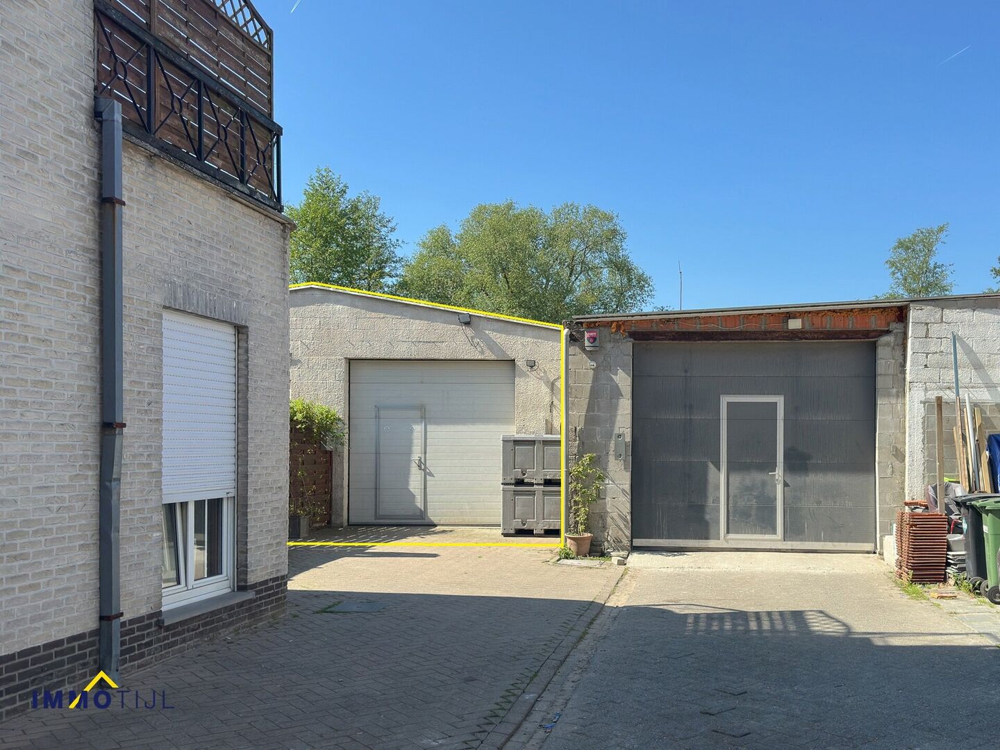 Gelegen op een groot perceel, beschikt het magazijn over een voorste poort met geïntegreerde deur en een achterste houten poort, wat zorgt voor een vlotte toegankelijkheid.