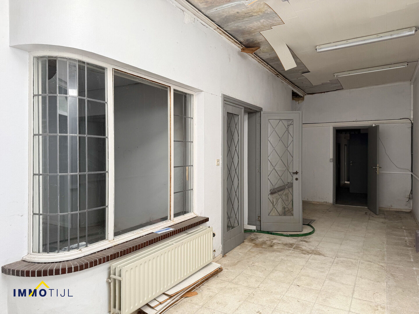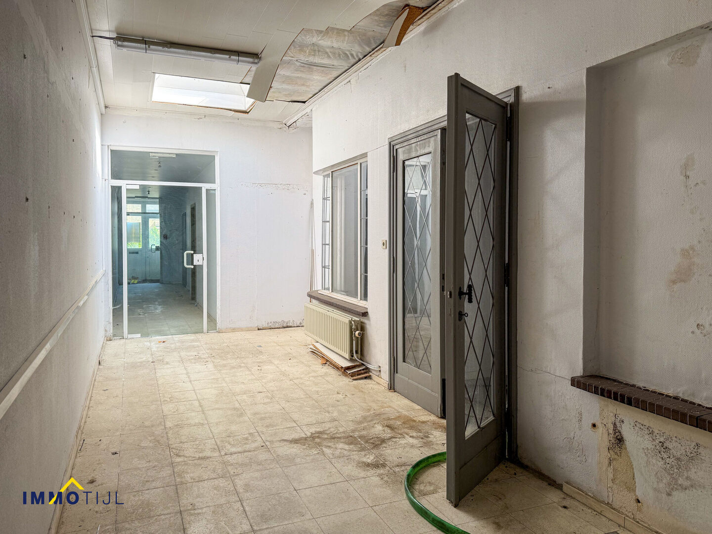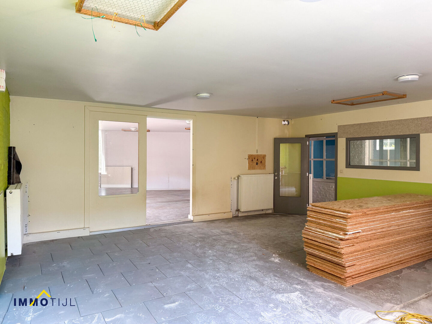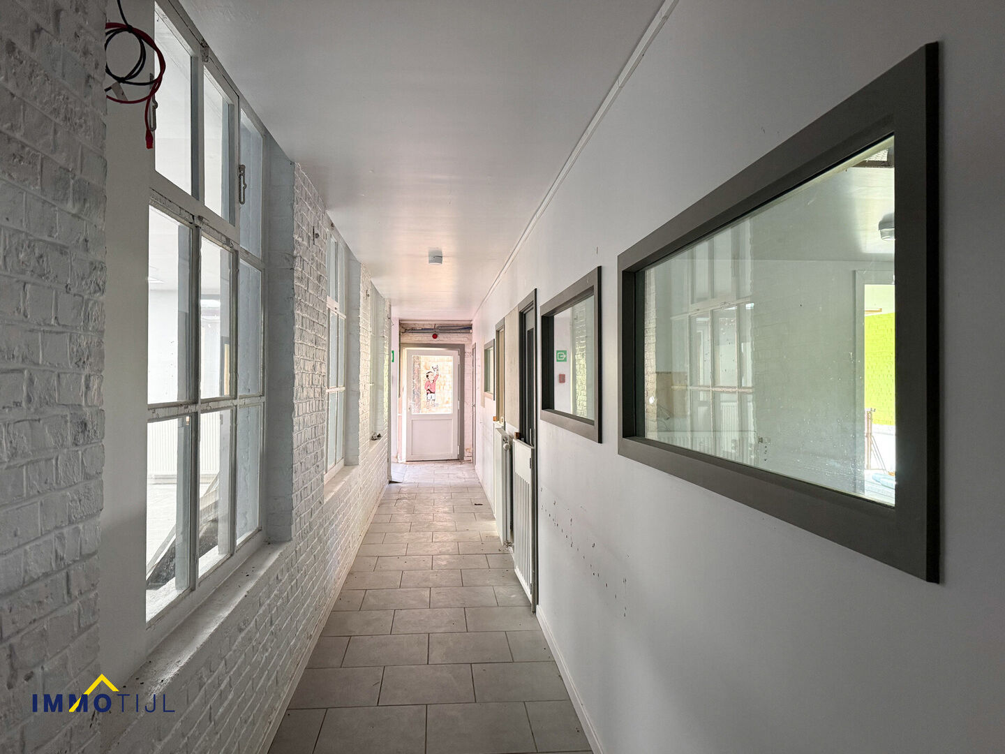 Het gebouw loopt verder door in een ruime gang die toegang geeft tot verschillende lokalen, die vroeger ingericht waren als crèche: