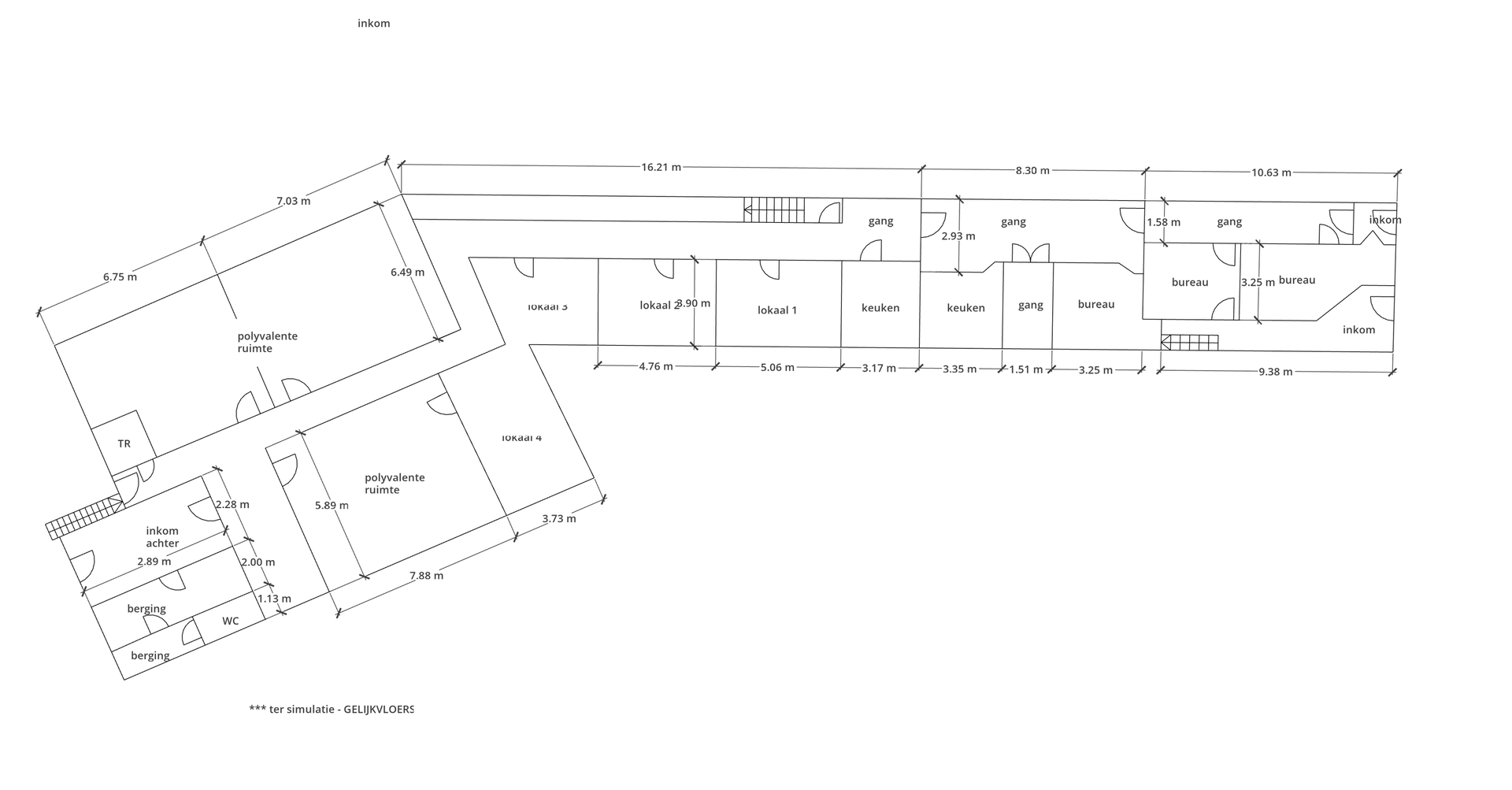 Lokaal 1: ca. 19 m², lokaal 2: ca. 18 m², lokaal 3: ca. 19 m², lokaal 4: ca. 22 m²