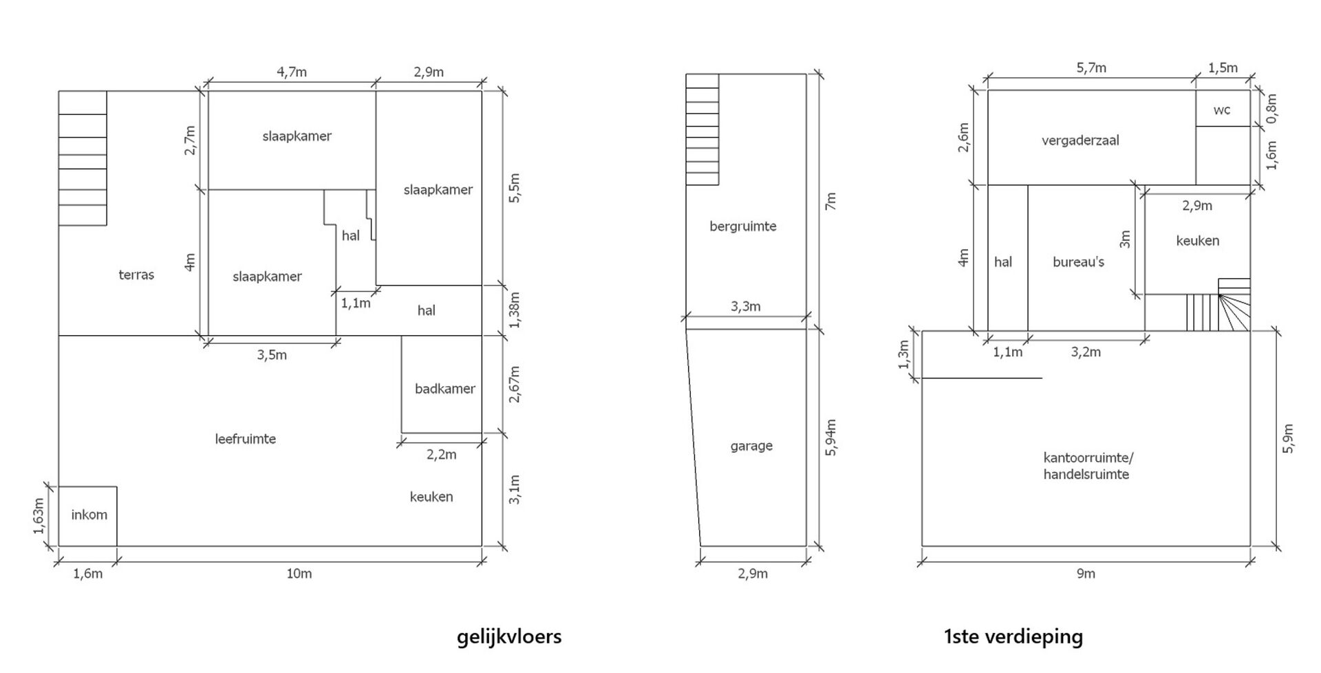 Op het gelijkvloers bevindt zich een handelsruimte, perfect geschikt als winkel of kantoor. Daarnaast zijn er een bureau, ruimte voor een keuken, een vergaderzaal en een afzonderlijk toilet aanwezig. De inpandige garage zorgt voor extra comfort en praktische parkeermogelijkheid. Voor het gebouw is er bovendien voldoende parkeerruimte aanwezig, wat het geheel nog aantrekkelijker maakt voor klanten en bezoekers.