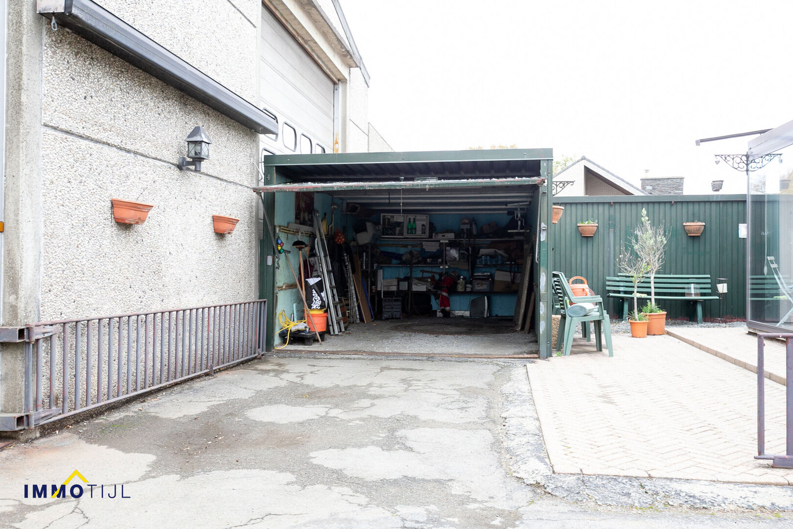 Achteraan, bereikbaar via de brede oprit, situeert zich de hangar met een oppervlakte van circa 300 vierkante meter (17,6m lang en 16,5m breed – hoogte midden is 6m10). Hoge inrijpoort. De loods deed dienst als voormalige carrosserie en is ideaal voor opslag of de uitoefening van een zelfstandige activiteit.