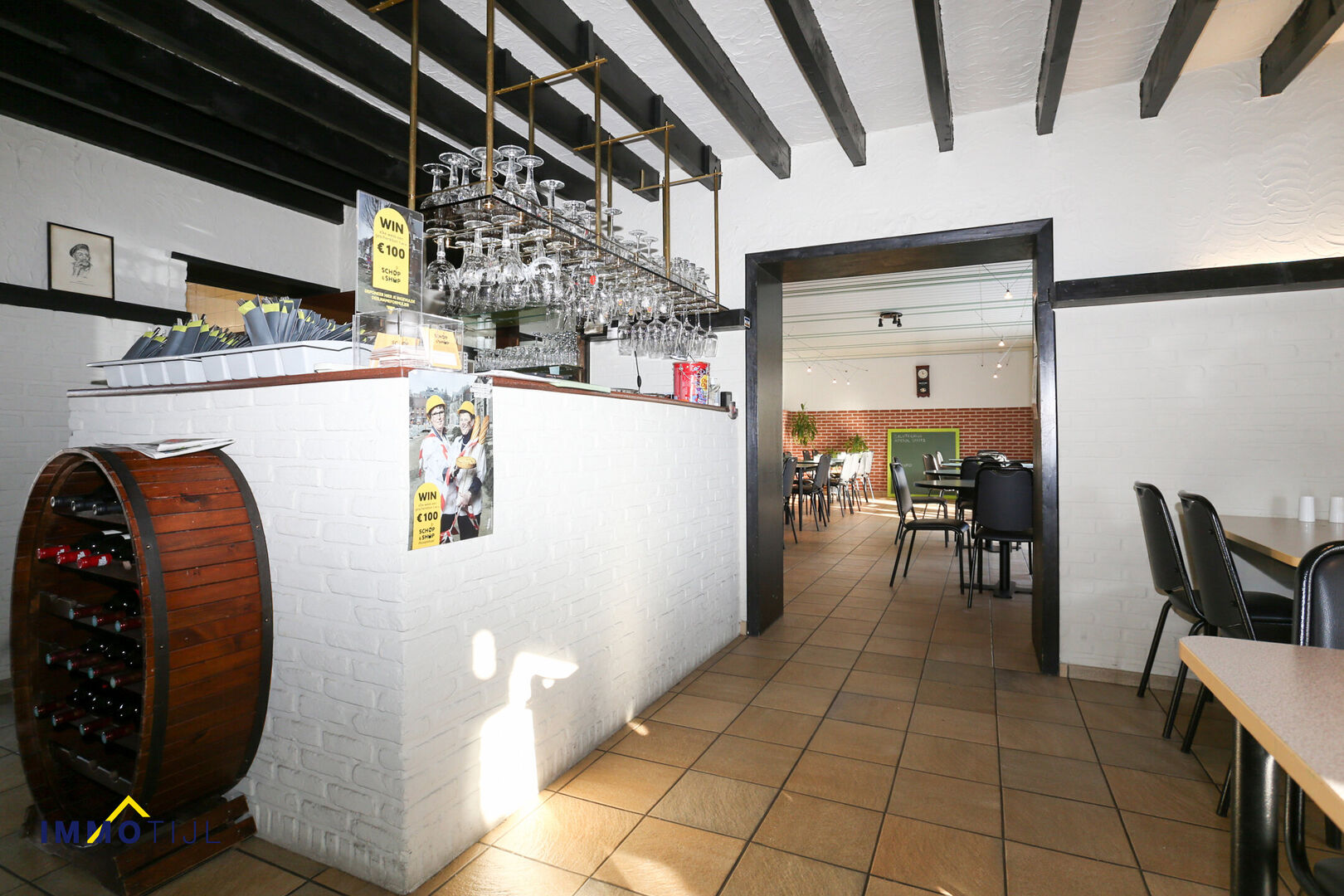 De zaak is volledig ingericht en onmiddellijk klaar voor gebruik, met onder meer een professionele keuken, een bar, een koelcel, toiletten, een bier- en wijnkelder en een dubbele eetzaal, waarvan één met rechtstreekse connectie naar het terras. Een gelijkaardige horecazaak kan hier zonder meer verdergezet worden, al leent het pand zich dankzij zijn indeling en ligging ook uitstekend voor andere commerciële of professionele activiteiten.Een gelijkaardige horecazaak is dus perfect mogelijk, maar het pand leent zich ook voor andere commerciële of professionele activiteiten.