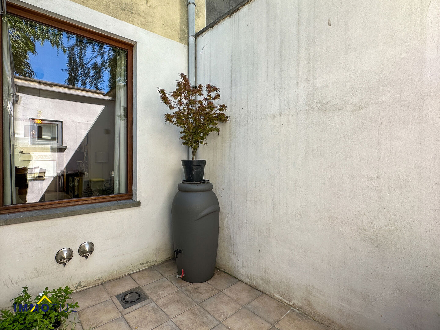 Deze gerenoveerde woning biedt op het gelijkvloers een inkomhal, een gezellige woonkamer met eetplaats een uitgeruste keuken en een apart toilet. Vanuit de keuken is er directe toegang tot een mooi terras.