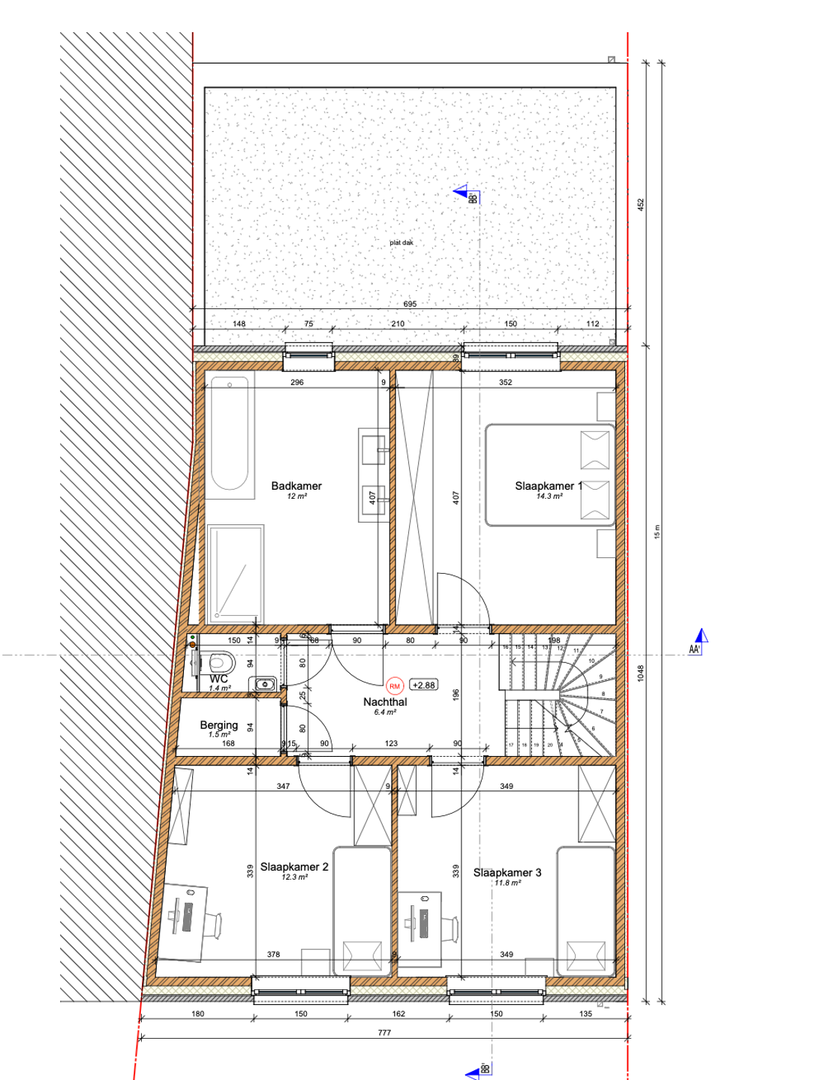De eerste verdieping bestaat uit een nachthal, een apart toilet, een berging, een badkamer en 3 slaapkamers.