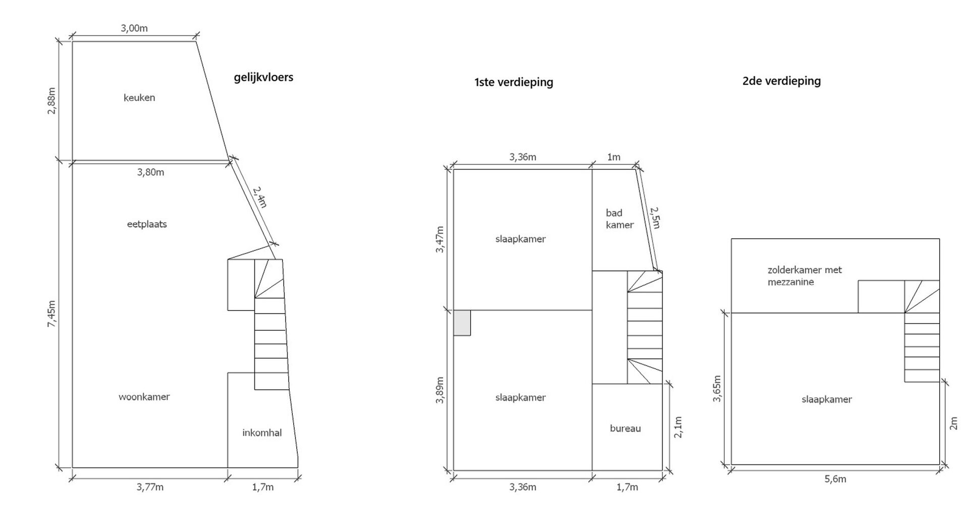 Op de eerste verdieping bevinden zich twee slaapkamers, bureau en een badkamer met douche in bad, lavabo en toilet. Op de tweede verdieping is er een derde, ruime slaapkamer, bovendien is er nog zolderkamer met mezzanine die verder kan worden afgewerkt als vierde slaapkamer.