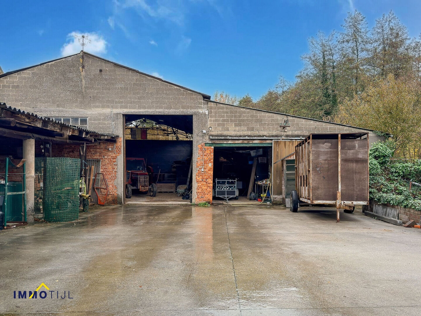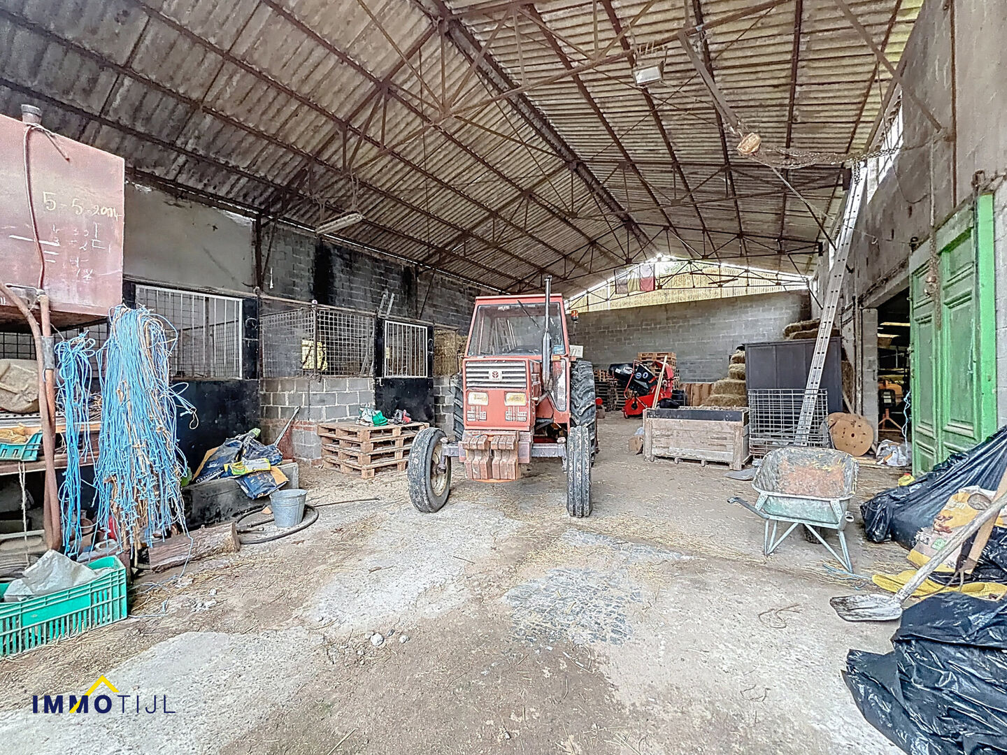 Achteraan het perceel bevindt zich, bereikbaar via de brede oprit, een uitzonderlijk ruime loods van circa 450 m² met grote toegangspoort. Dankzij de hoogte en oppervlakte biedt dit gebouw tal van mogelijkheden: stockage, atelier, werkruimte, stalling van voertuigen of een combinatie ervan. De bestaande indeling laat bovendien ruimte om het geheel verder te optimaliseren of aan te passen aan uw eigen noden.
