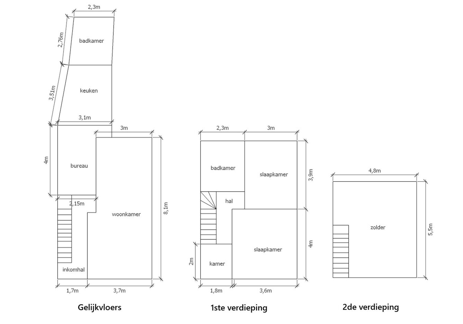 Op de eerste verdieping zijn er twee ruime slaapkamers, een extra kamer (ideaal als bureau of hobbyruimte), en een badkamer (bad, douche, toilet en lavabo). De vaste trap naar de zolderverdieping geeft toegang tot het creëren van een extra slaapkamer (uitbreidingsmogelijkheid).