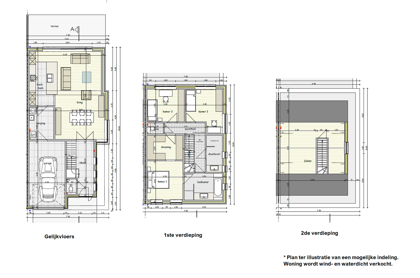 Op de verdieping is er ruimte voorzien voor 3 slaapkamers, een dressing, 2 badkamers en een apart toilet. Verder is er nog een zolder aanwezig, waar mogelijk nog een extra kamer gemaakt kan worden.
