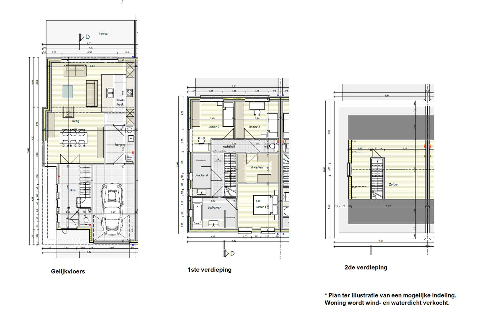 Op de verdieping is er ruimte voorzien voor 3 slaapkamers, een dressing, 2 badkamers en een apart toilet. Verder is er nog een zolder aanwezig, waar mogelijk nog een extra kamer gemaakt kan worden.