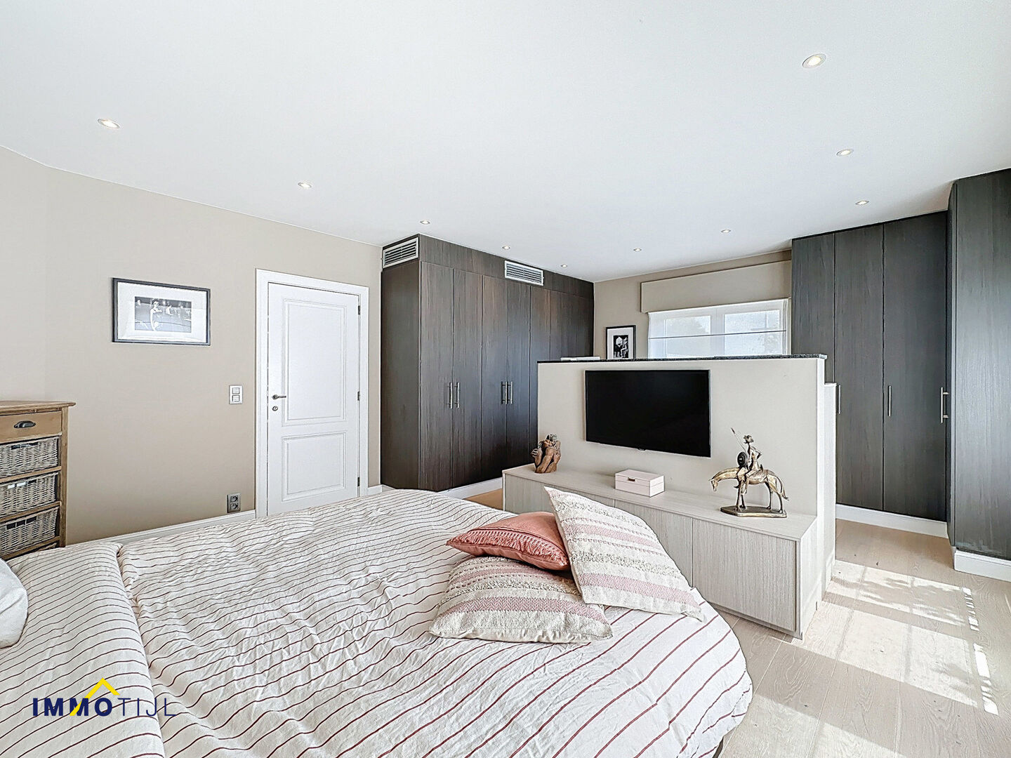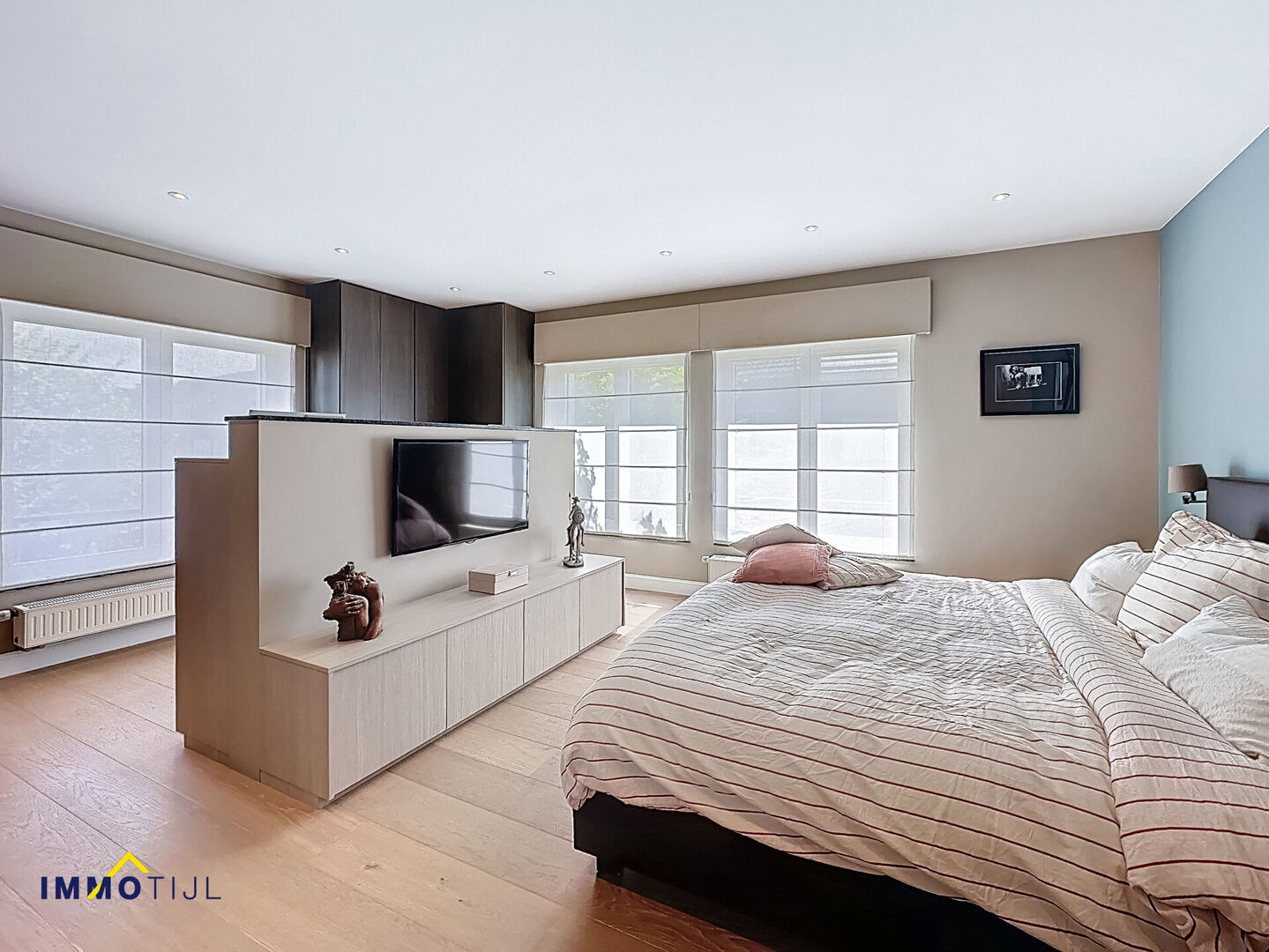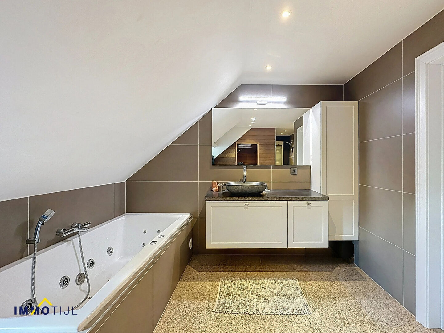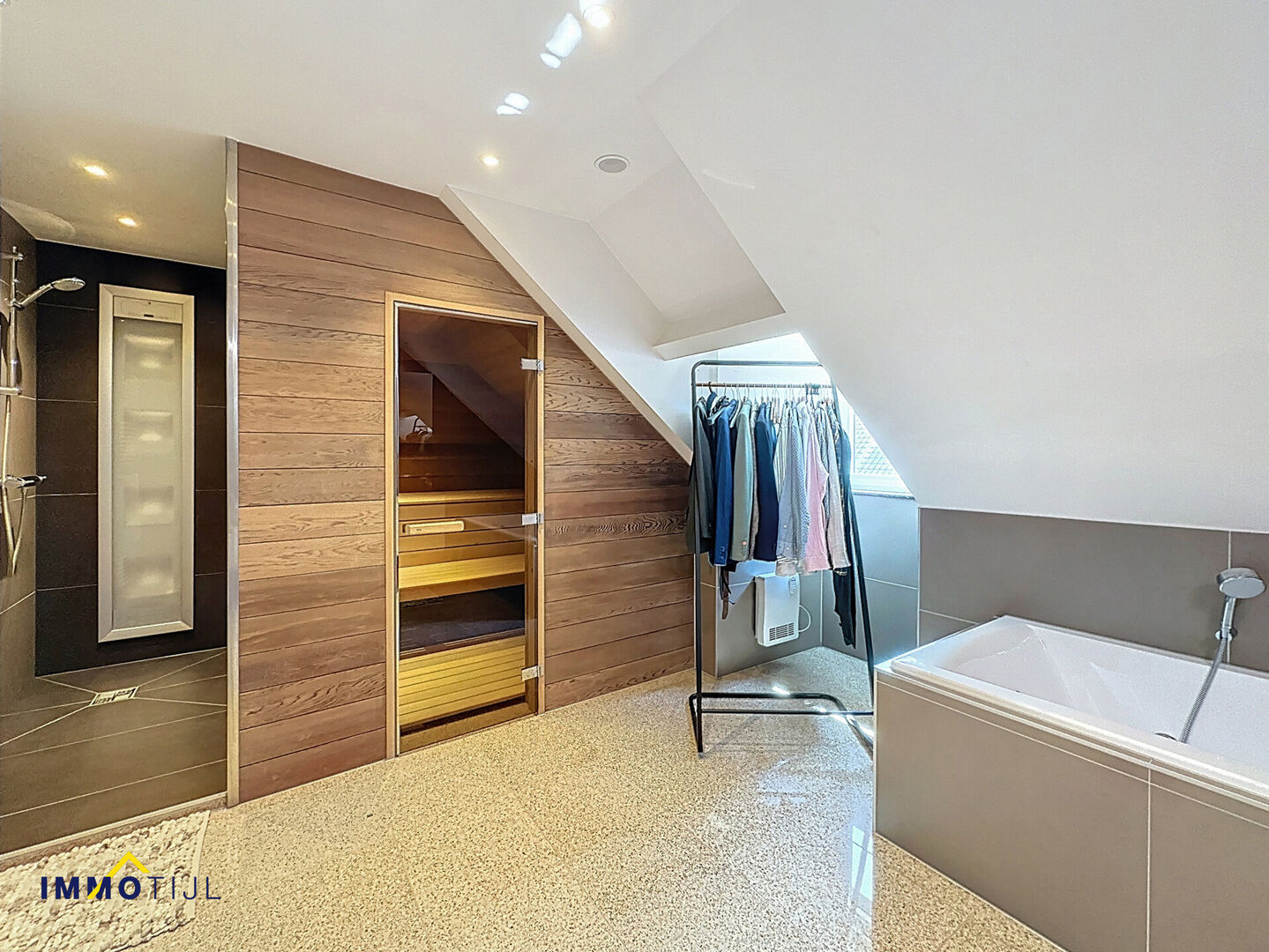 Op de 1ste verdieping (voorzien van een prachtige parketvloer) vindt men 2 ruime slaapkamers en een badkamer met inloopdouche, lavabomeubel en toilet. De 2de verdieping is ingericht als luxueuze ontspanningsruimte of derde slaapkamer, voorzien van een sfeerhaard, een extra toilet en een complete wellnessbadkamer (incl. infrarooddouche met zonnebankfunctie, een sauna, een massagebad en een stijlvol lavabomeubel.