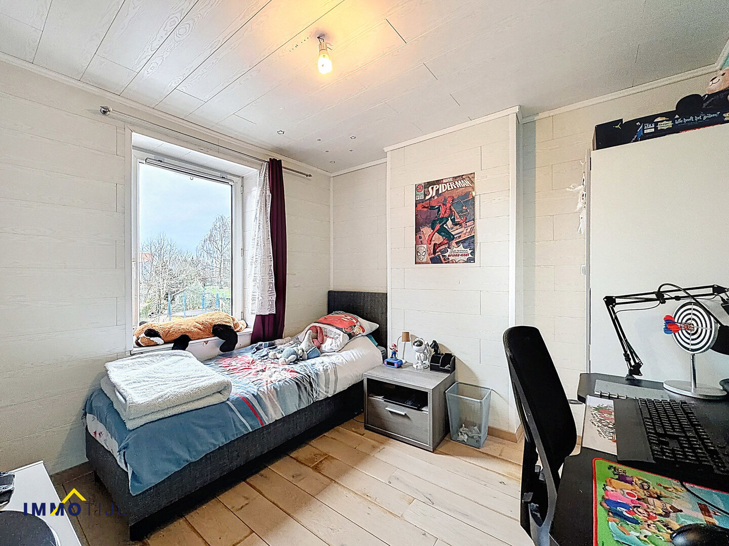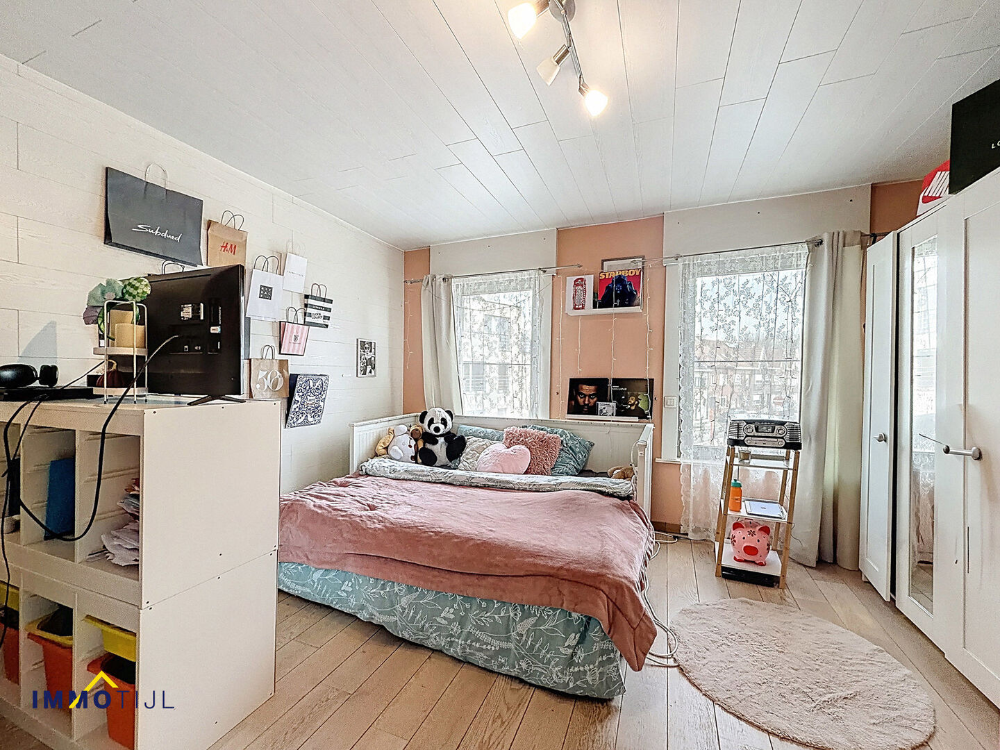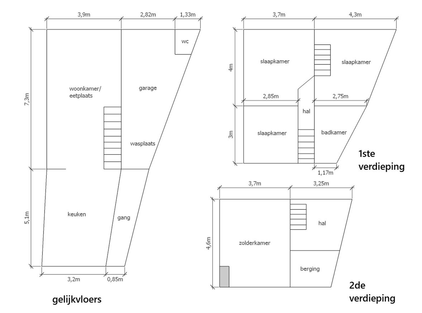 Het gelijkvloers omvat een aangename leefruimte, een volledig ingerichte keuken en een apart toilet. Op de eerste verdieping vindt u drie slaapkamers en een vernieuwde badkamer, uitgerust met douche, lavabomeubel en toilet. De tweede verdieping, bereikbaar via een vaste trap, biedt een extra kamer en praktische bergruimte.