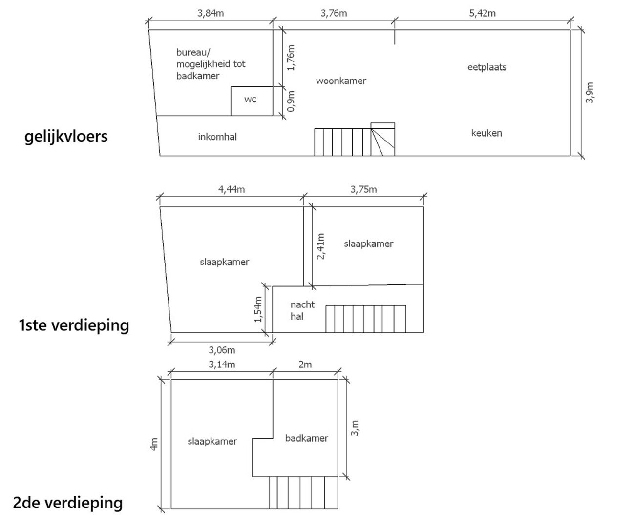 Op de eerste verdieping bevinden zich twee volwaardige slaapkamers. De tweede verdieping, bereikbaar via een vaste trap, herbergt een derde slaapkamer en een moderne badkamer uitgerust met een ligbad, lavabomeubel en toilet.