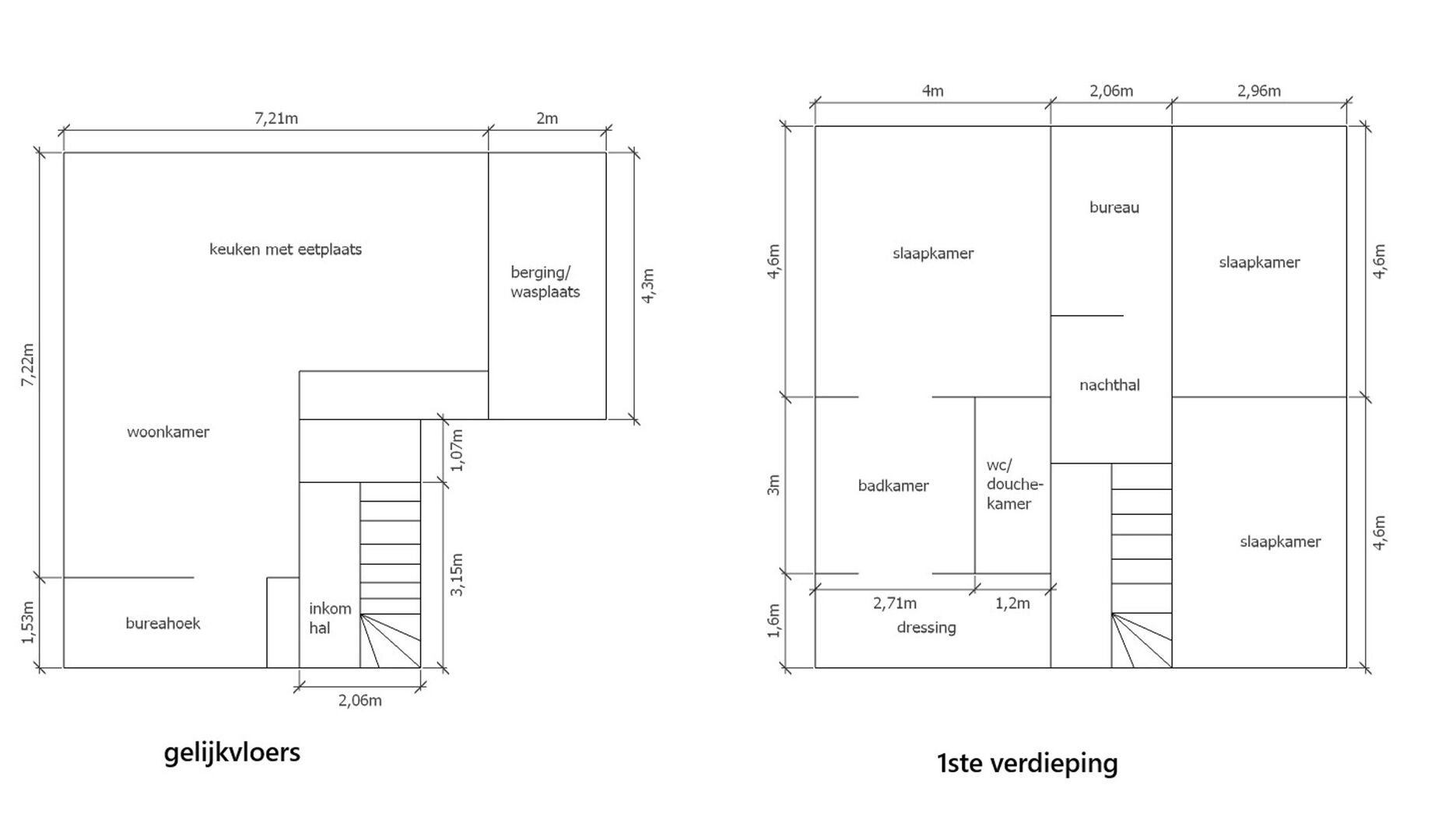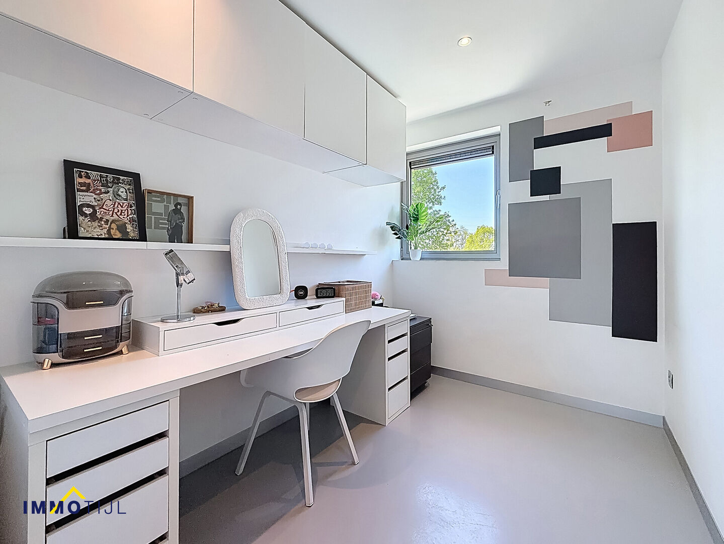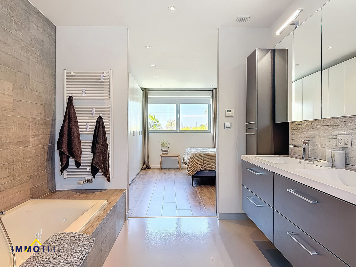 Op de eerste verdieping bevinden zich drie volwaardige slaapkamers en een bureauruimte op de overloop. Verder is er een moderne douchekamer met toilet en lavabo. De bijzonder ruime masterbedroom beschikt over een ensuite badkamer, uitgerust met een dubbele lavabo en ligbad. De dressing maakt het geheel compleet.