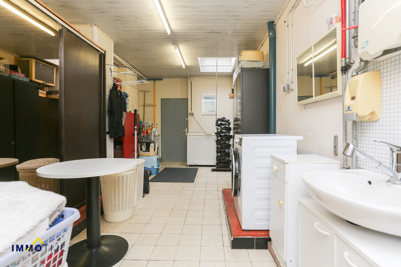 Op het gelijkvloers bevindt zich een ruime inkomhal, apart toilet, lichtrijke leefruimte met volledig geïnstalleerde keuken met berging, een ruim bureau, een polyvalente ruimte (ideaal als bureel of kantoor) en meerdere opslagplaatsen waaronder een magazijn van circa 270m².