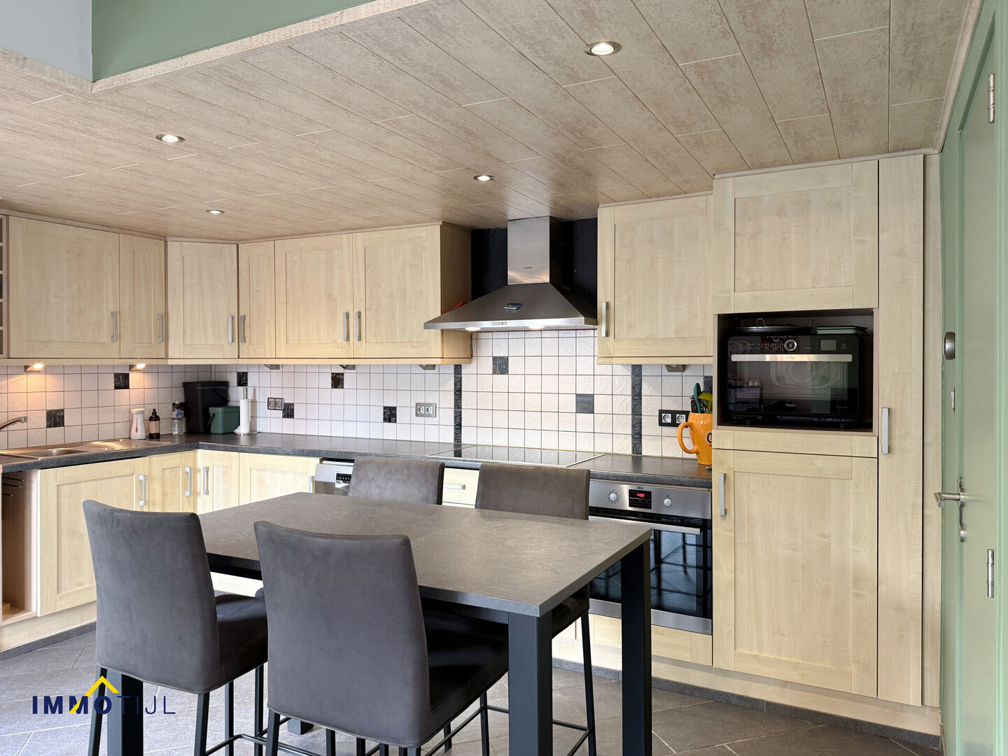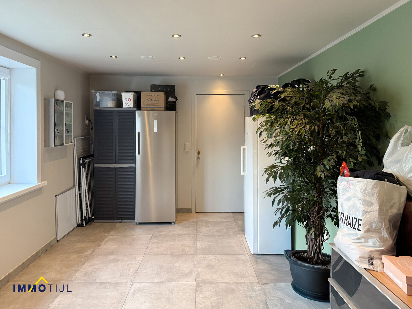 Bij het binnenkomen betreedt u de inkomhal met apart gastentoilet. De woning beschikt over een ruime leefruimte met eetplaats en een open keuken met afgesloten bergruimte. Achter de keuken bevindt zich een extra kamer, momenteel ingericht als speelhoek, maar perfect geschikt als bureau of hobbyruimte. Verder door is er een wasplaats met aansluiting voor wasmachine en aansluitend nog een polyvalente ruimte van ca. 20 m², momenteel ingericht als stockage.