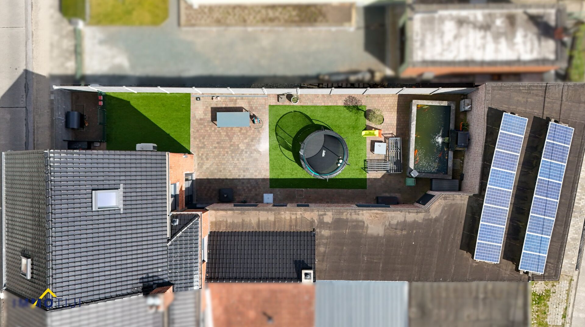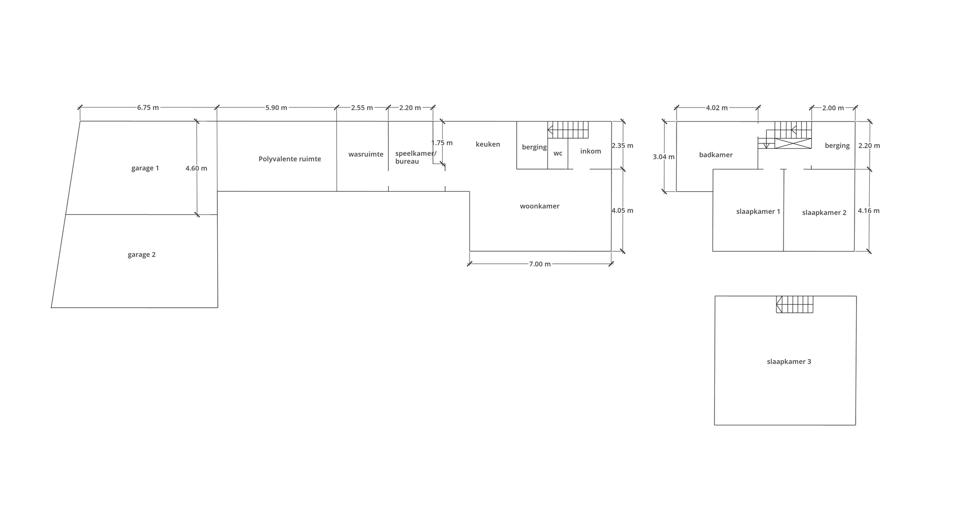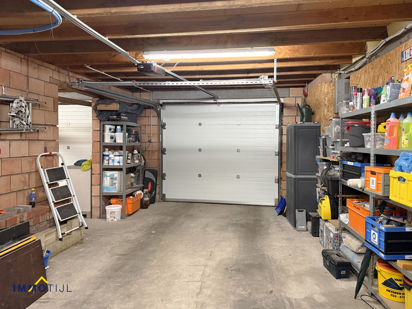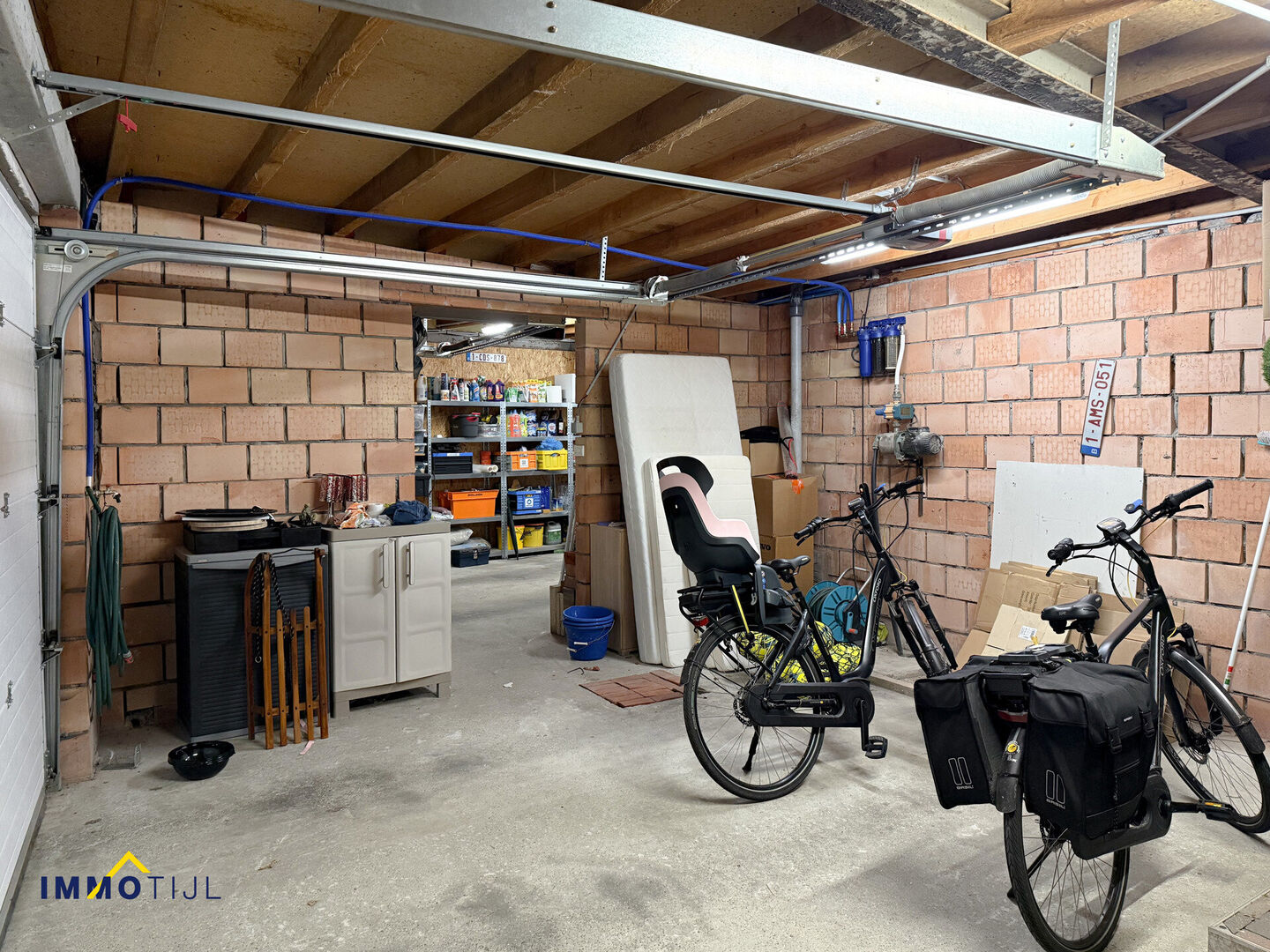 Achteraan bevinden zich nog twee ruime garages, beide uitgerust met een elektrische poort en een aparte achterdeur.