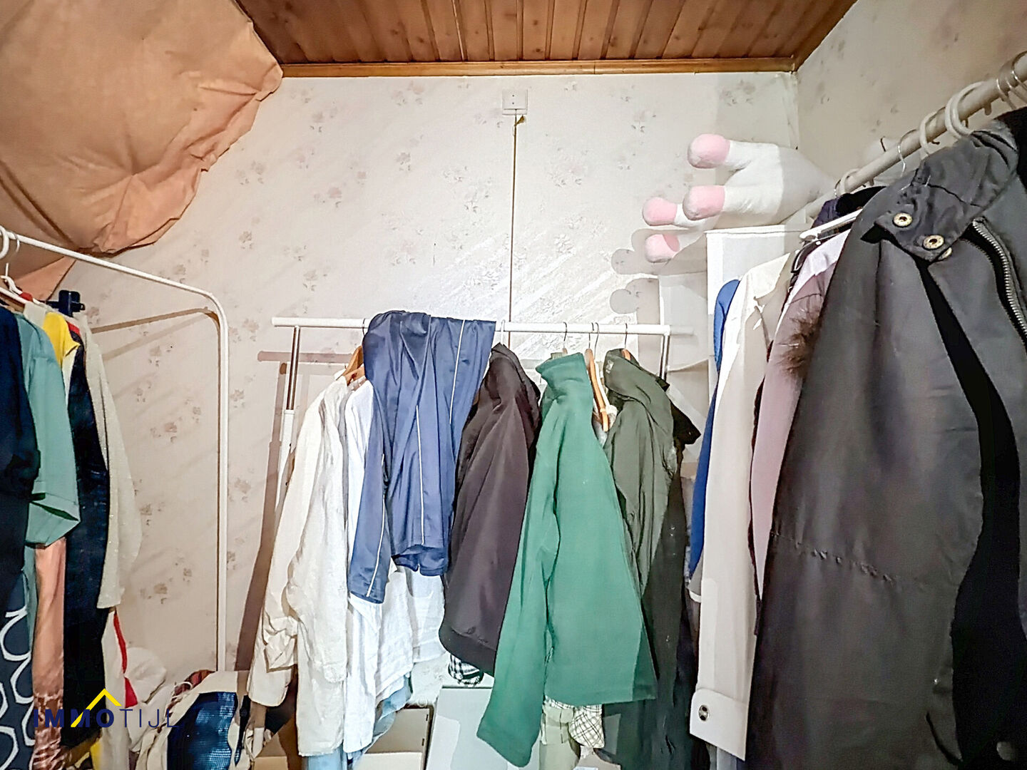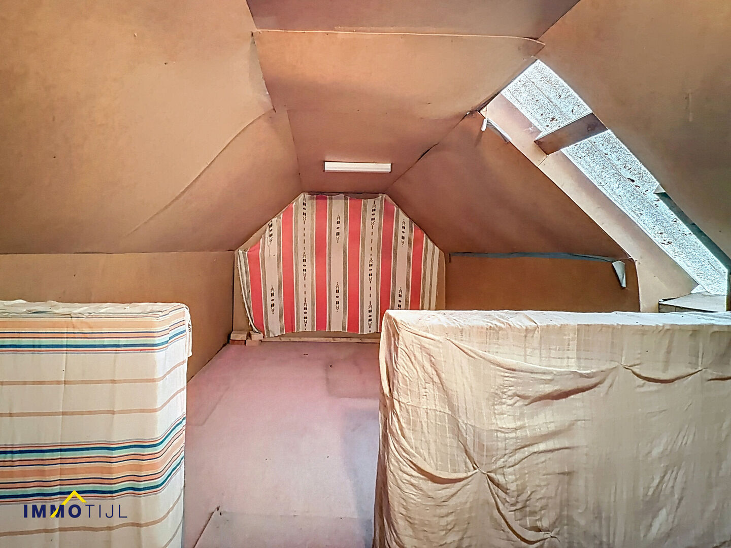 Op de eerste verdieping bevindt zich een ruime slaapkamer en dressing. Daarnaast is er een extra kamer die na renovatie perfect kan dienen als tweede slaapkamer. Via een luik is de zolder bereikbaar, die extra opslagruimte biedt.
