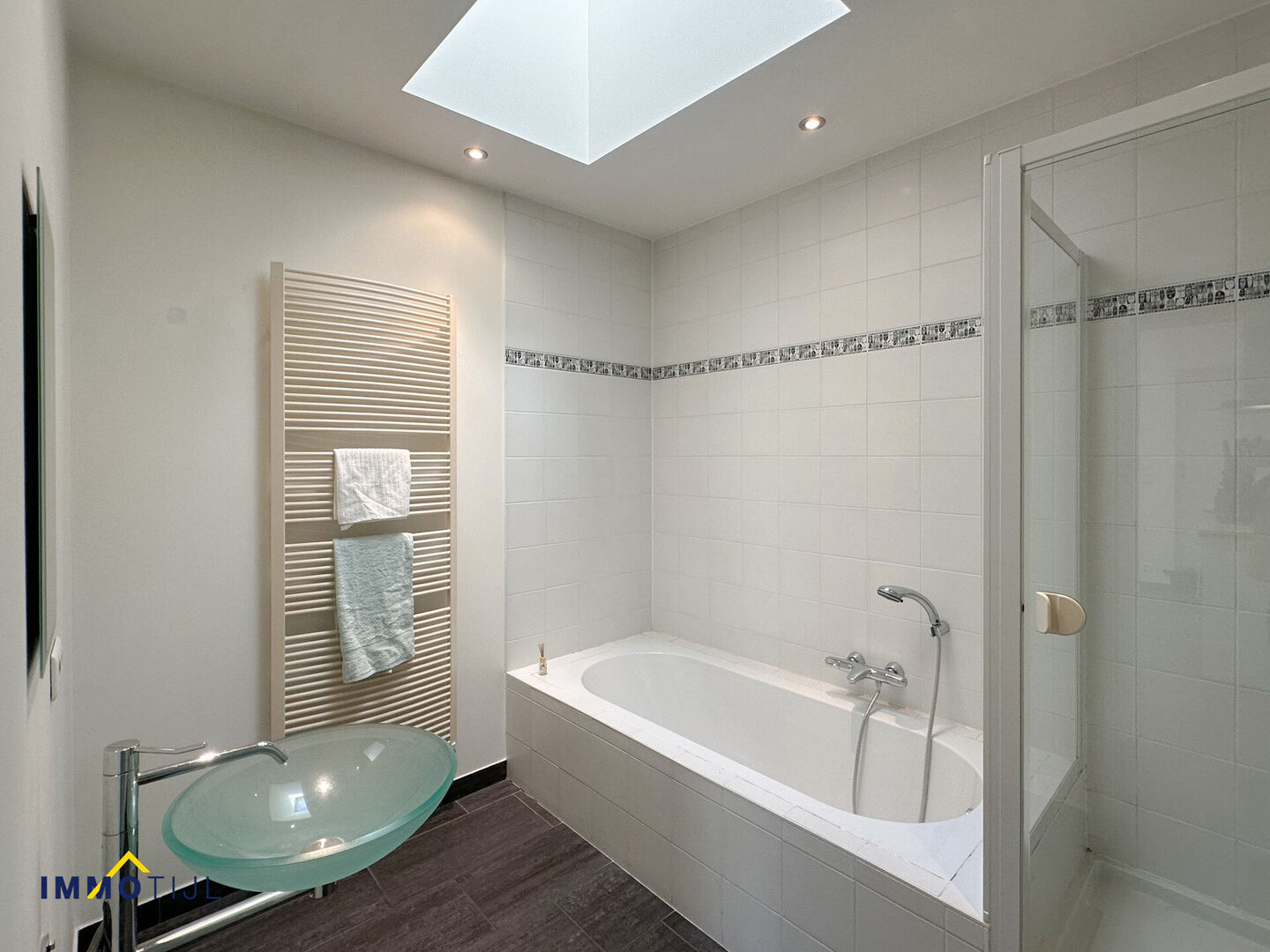 Daarnaast beschikt het gelijkvloers over een gastentoilet, een eerste badkamer met douche en lavabo, en een praktische berging met wasruimte die toegang biedt tot het terras en de tuin.
