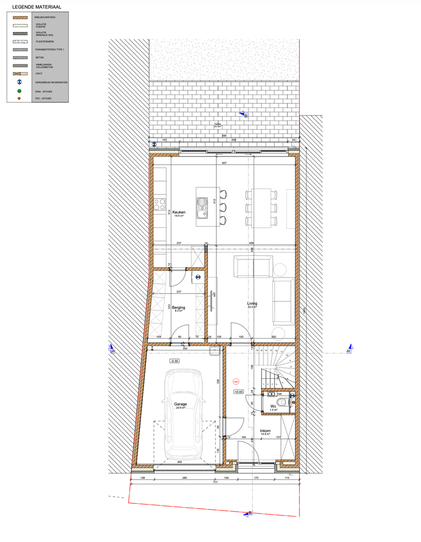 Deze gesloten bebouwing bestaat uit een inkom met apart toilet, een garage, een berging en een leefruimte met open keuken. Vanuit de leefruimte bereikt men het terras met een aangename tuin uitkijkend op de velden.