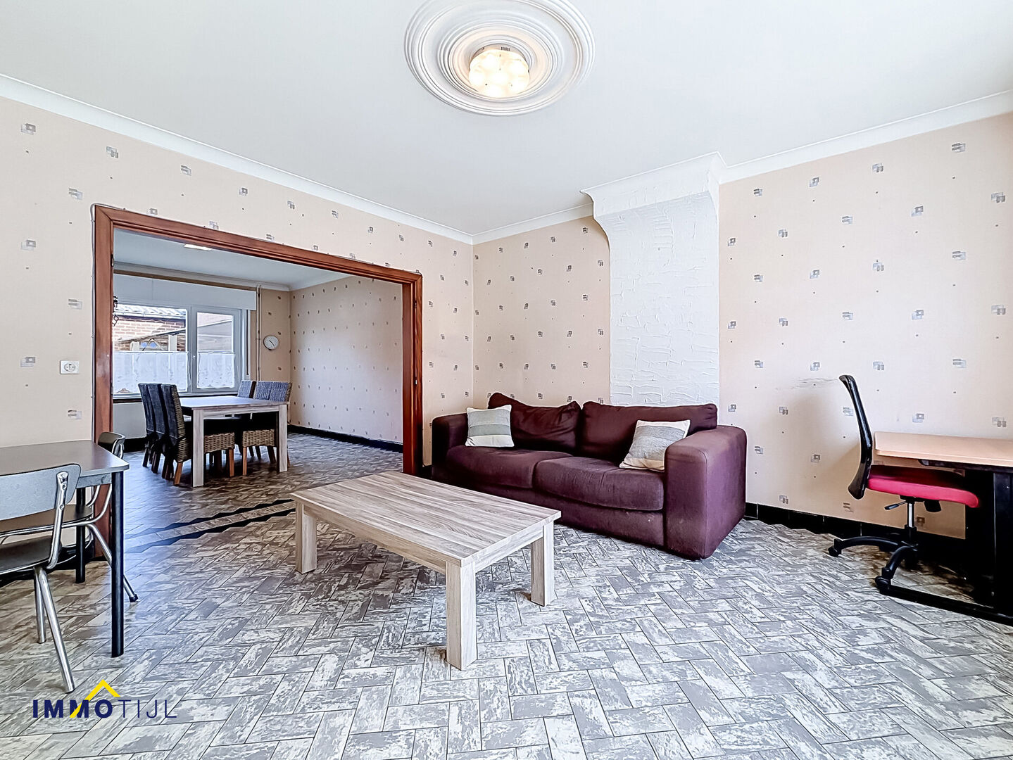 Het gelijkvloers omvat een ruime leefruimte met eetplaats en een te renoveren keuken met rechtstreekse toegang tot de tuin.