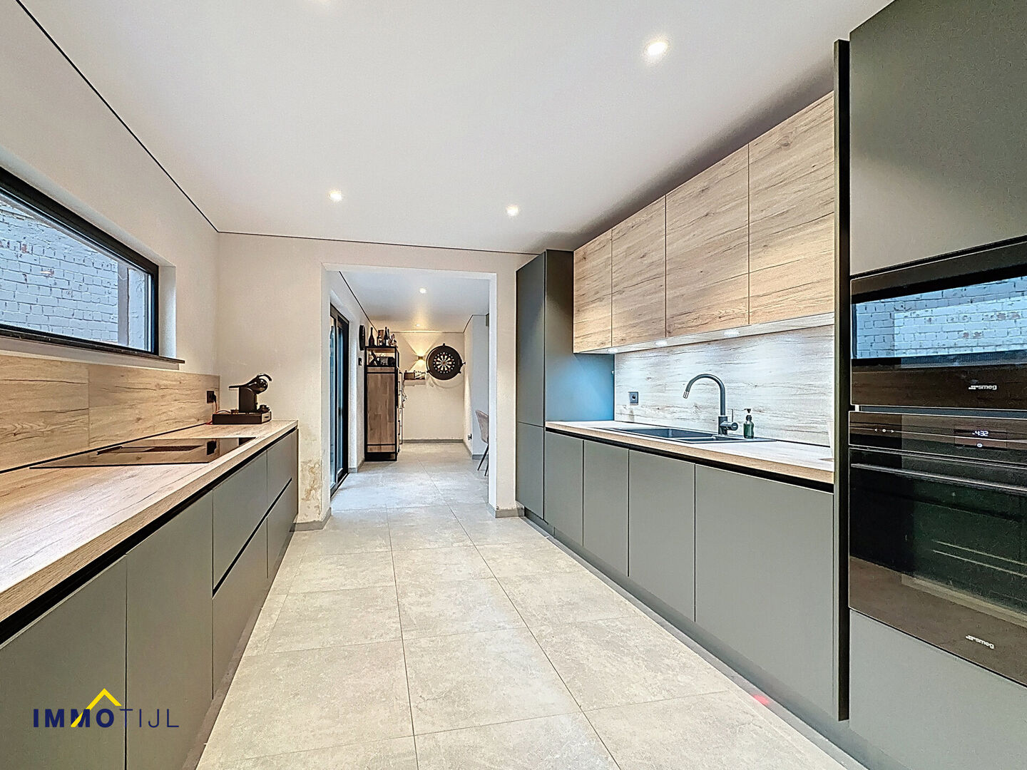 Deze recent gerenoveerde woning verwelkomt u op het gelijkvloers met een ruime inkomhal met gastentoilet en een lichtrijke woonkamer, waar een veelzijdige hoek werd gecreëerd die perfect dient als bureauruimte of speelhoek. De moderne keuken is volledig uitgerust met hoogwaardige SMEG-toestellen. Verder vindt u op deze verdieping een stijlvolle badkamer met inloopdouche en dubbele lavabo en een praktische berging/wasplaats.