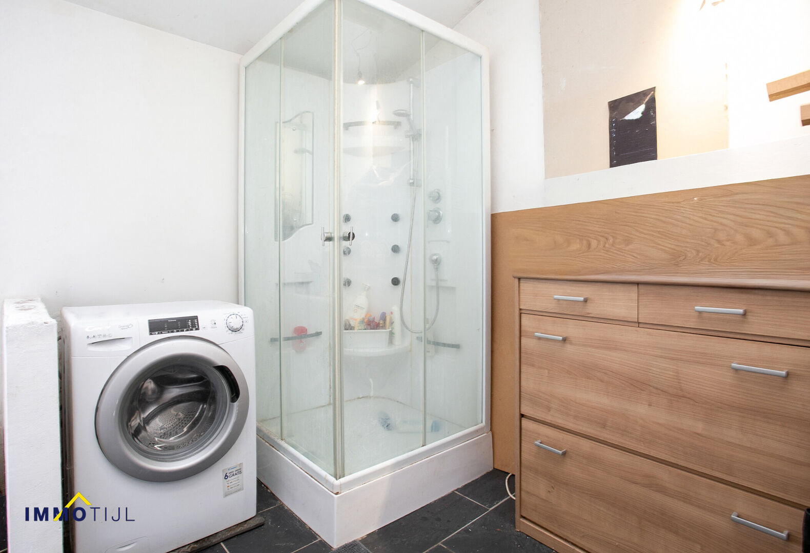 Indeling: op het gelijkvloers: inkomhal, ruime leefruimte, keuken, bergruimte, badkamer met aansluiting voor wasmachine en droogkast, douche en toilet.