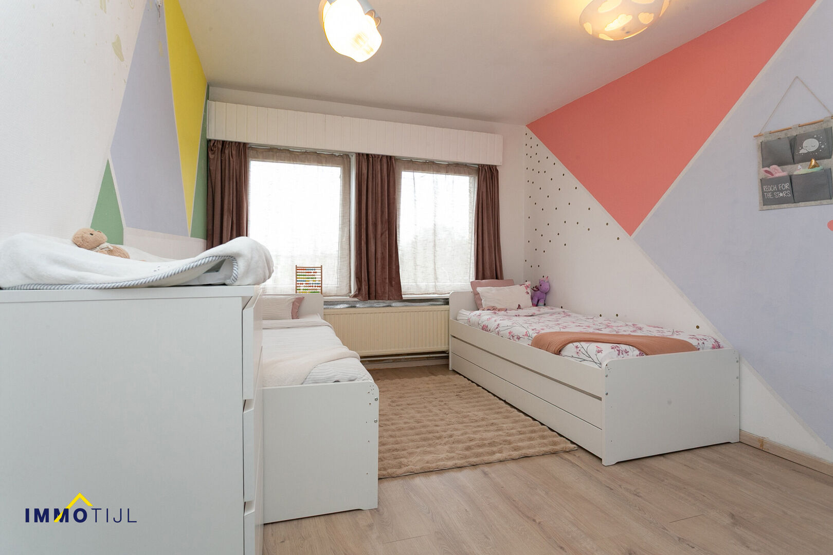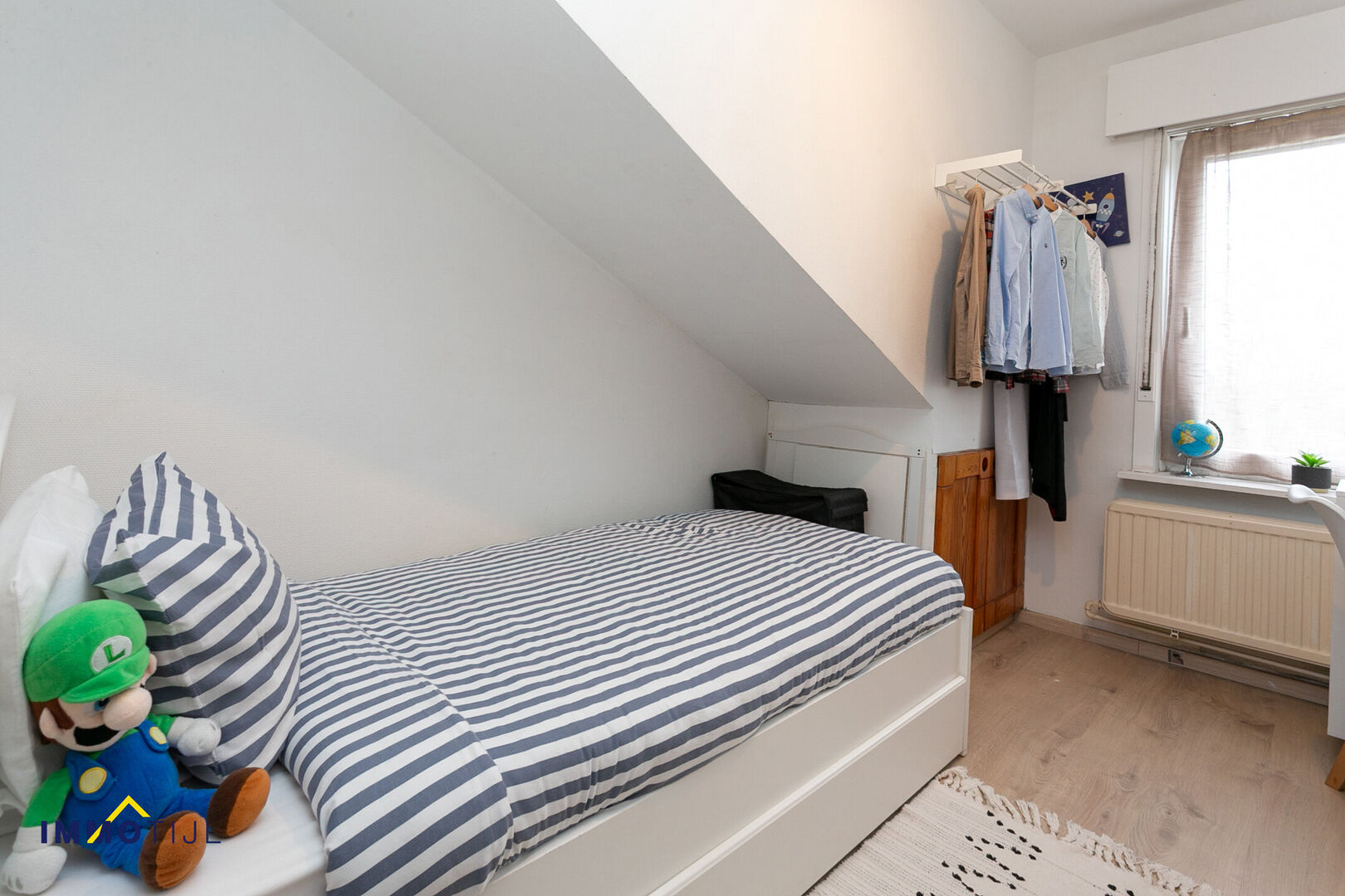 Indeling gelijkvloers: inkomhal, garage, wasplaats, bureau achteraan. Eerste verdieping: lichtrijke leefruimte, functionele keuken, doucheruimte. Er is ook een apart toilet en overal ingemaakte kasten. Tweede verdiep telt 2 grote en 1 kleinere kamer.