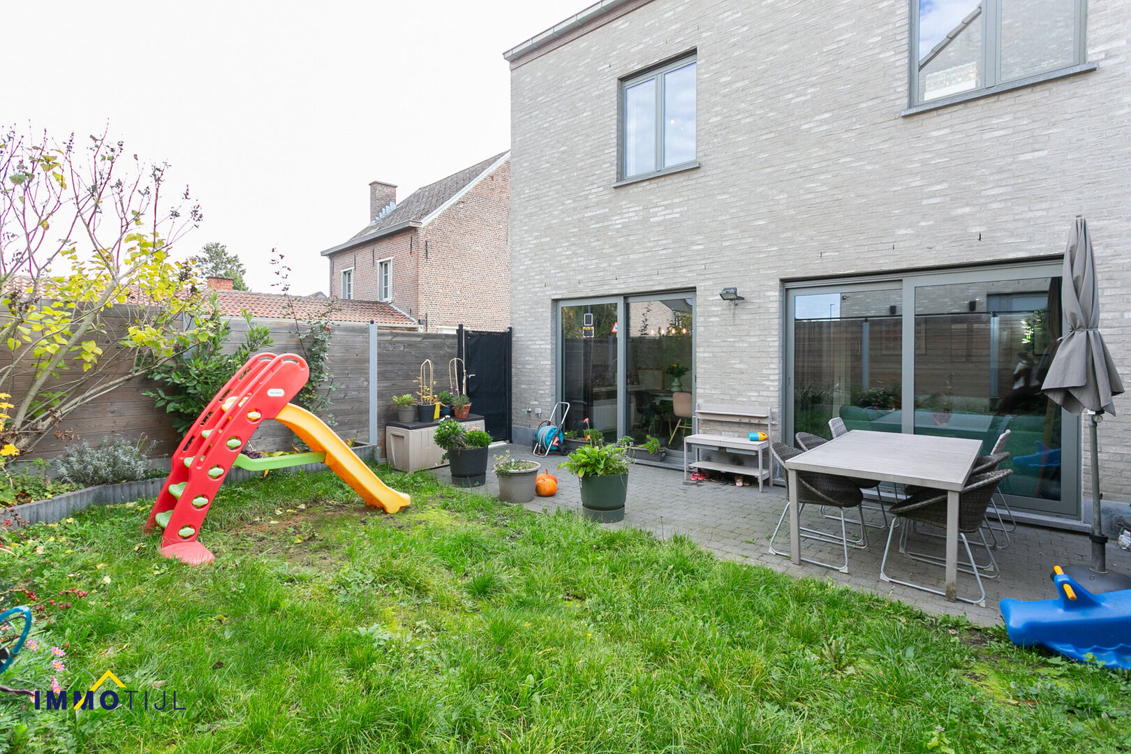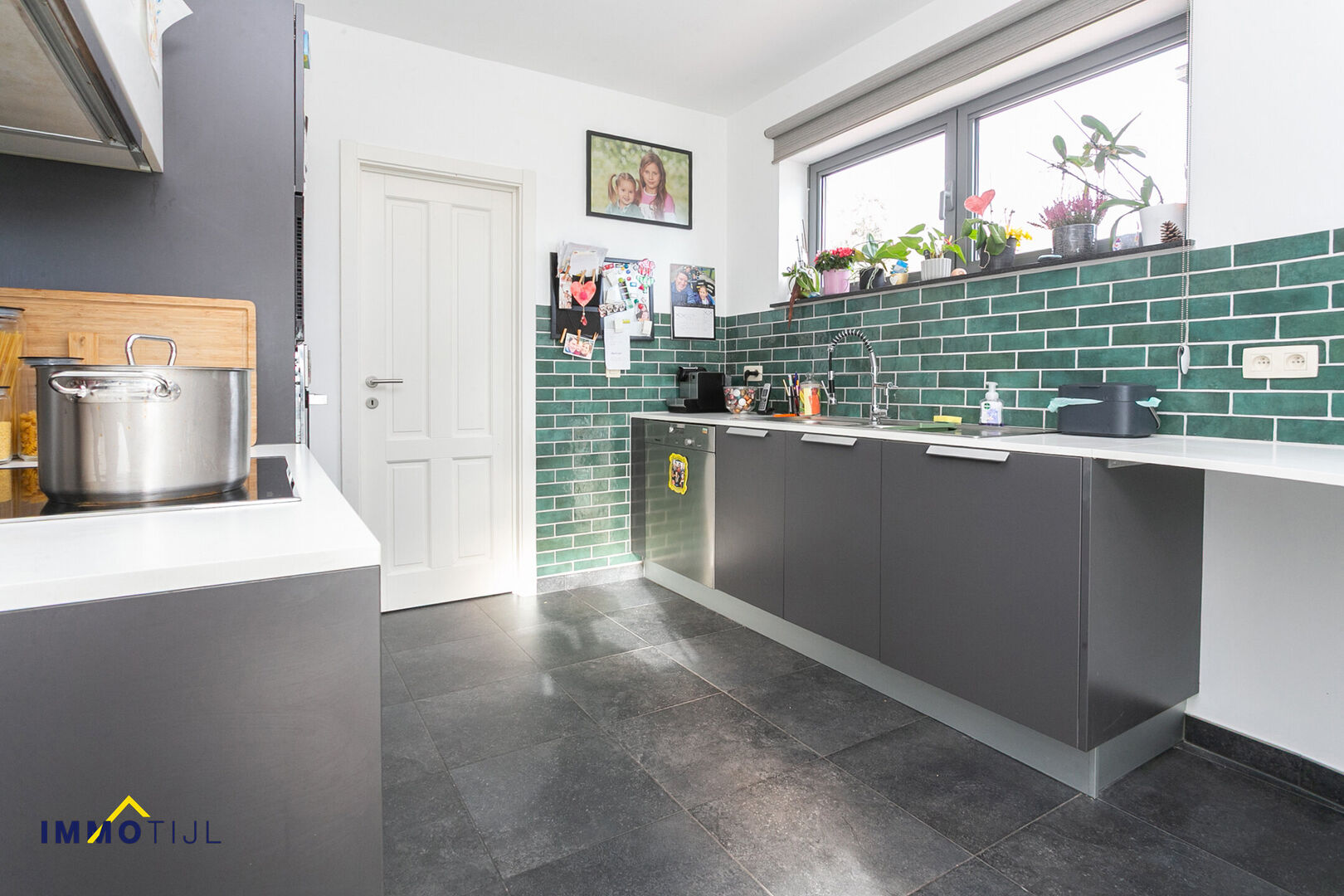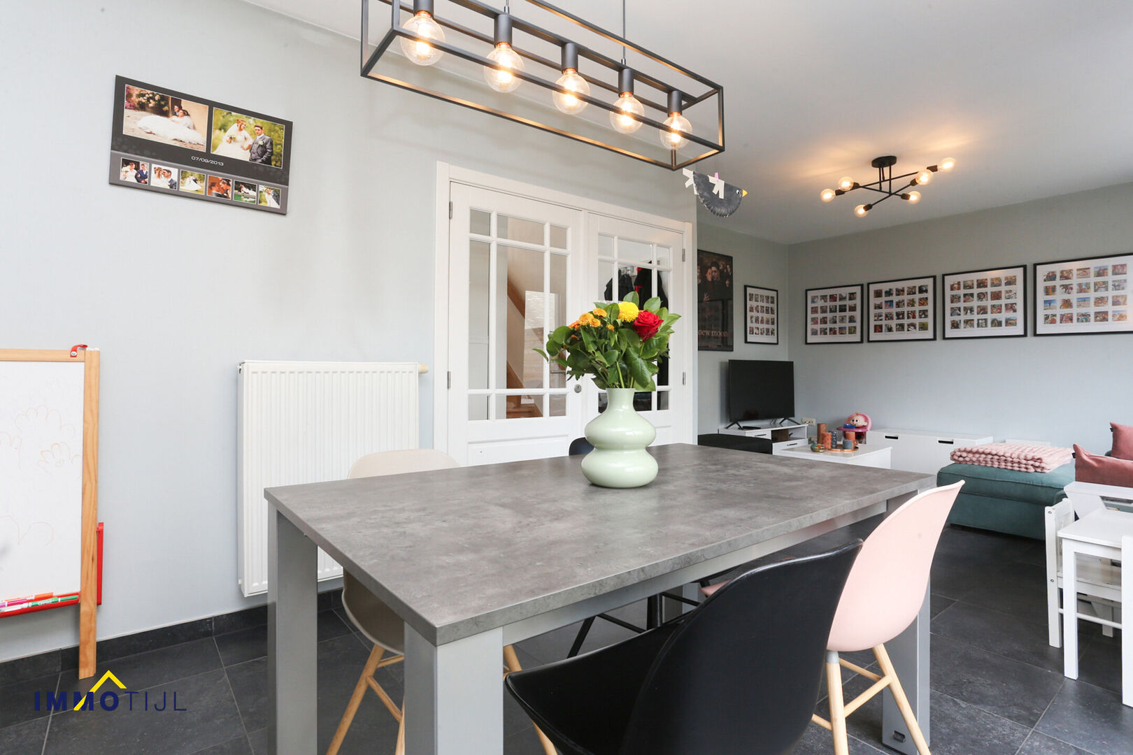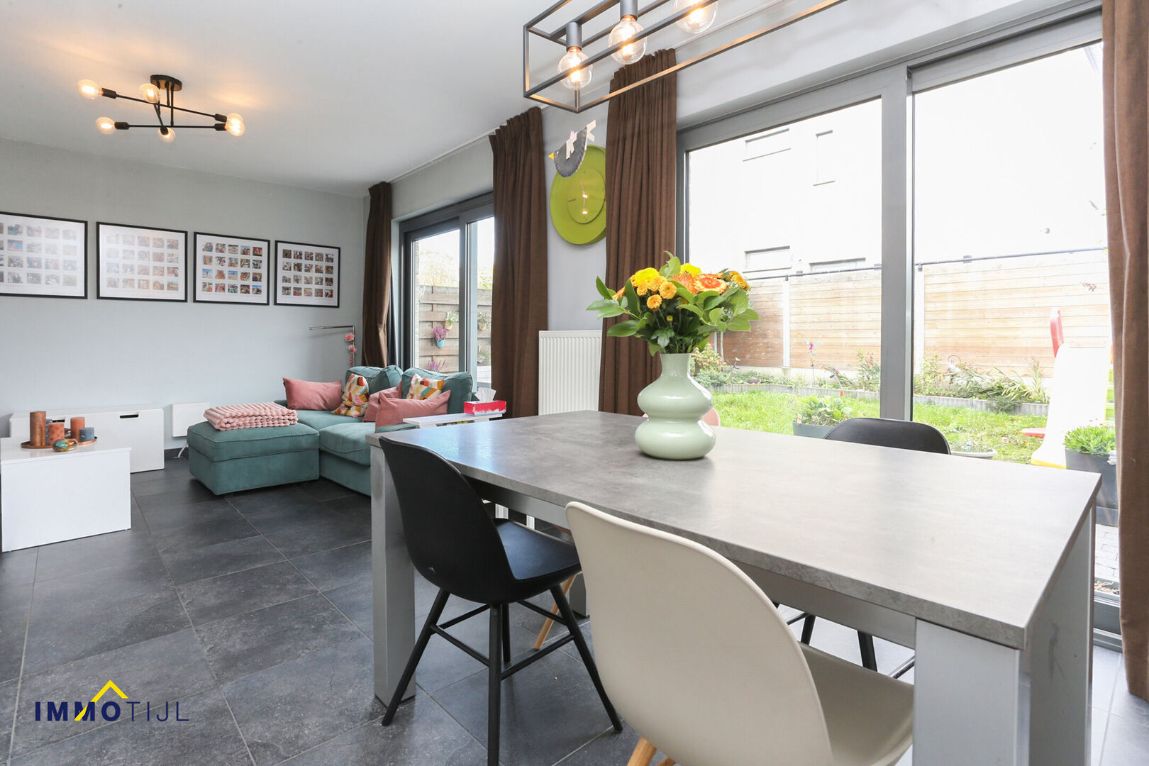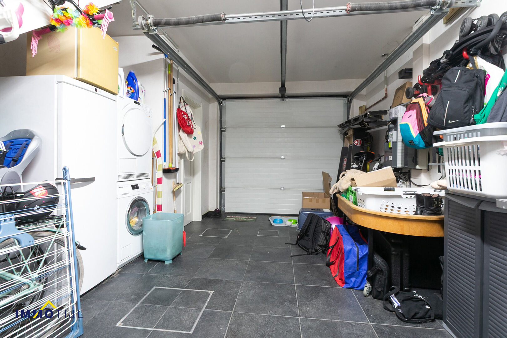 Je komt binnen via de inpandige garage met directe toegang tot de keuken en berging, of via de voordeur in de lichte inkomhal. De gezellige leefruimte met grote ramen biedt een mooie connectie met het terras en de tuin, waardoor binnen en buiten naadloos in elkaar overlopen.