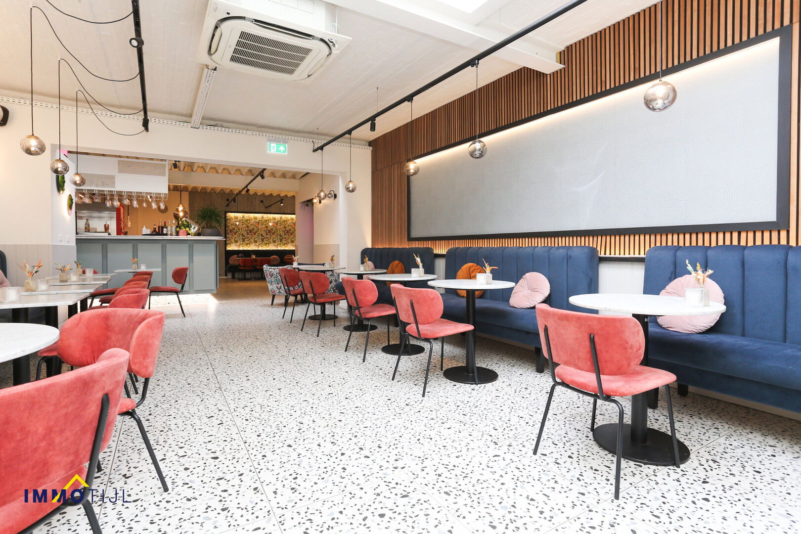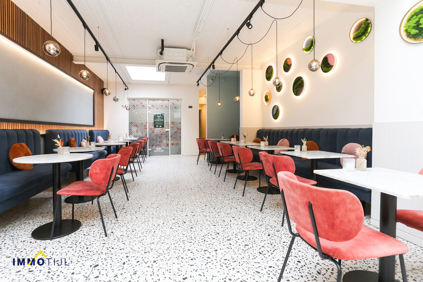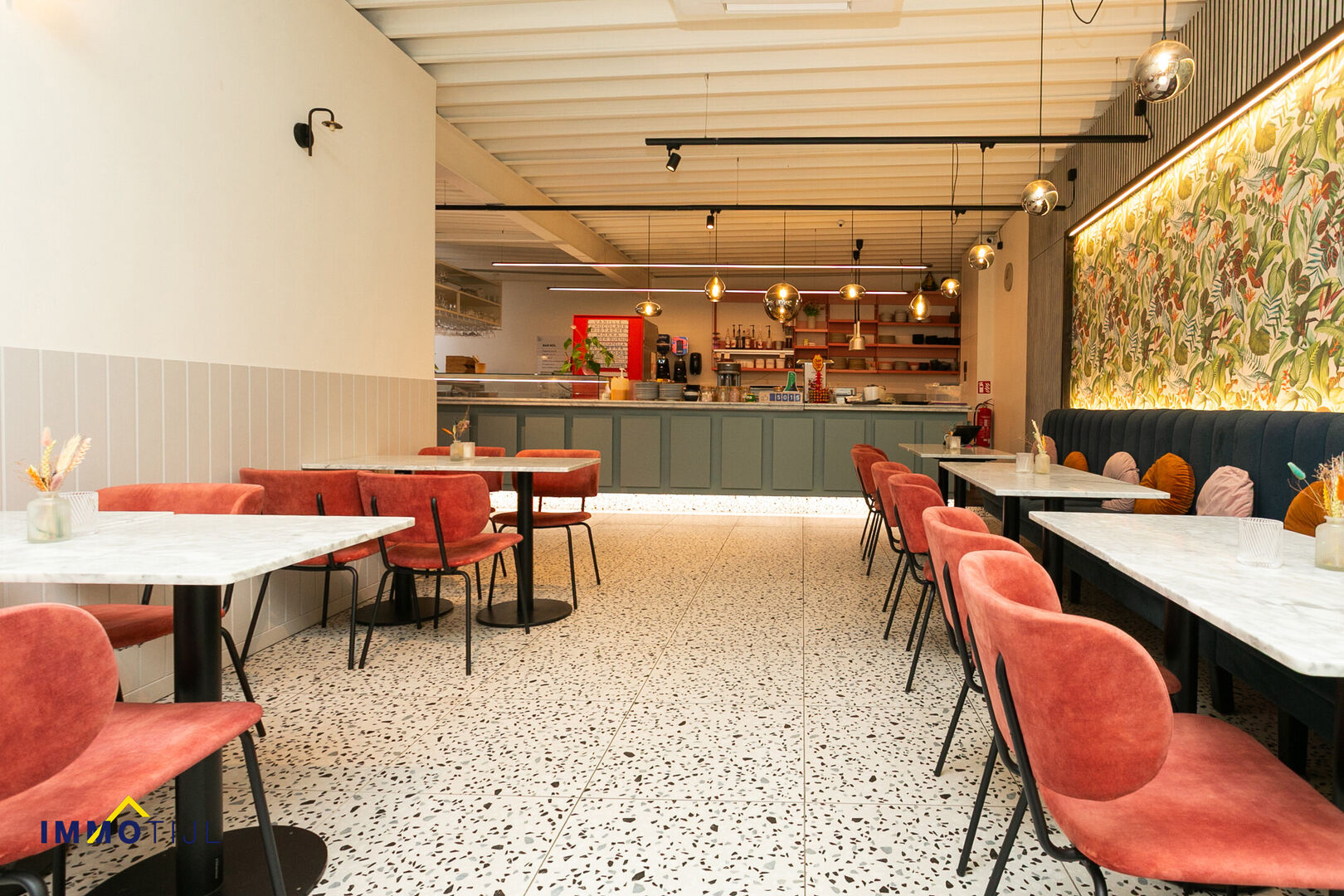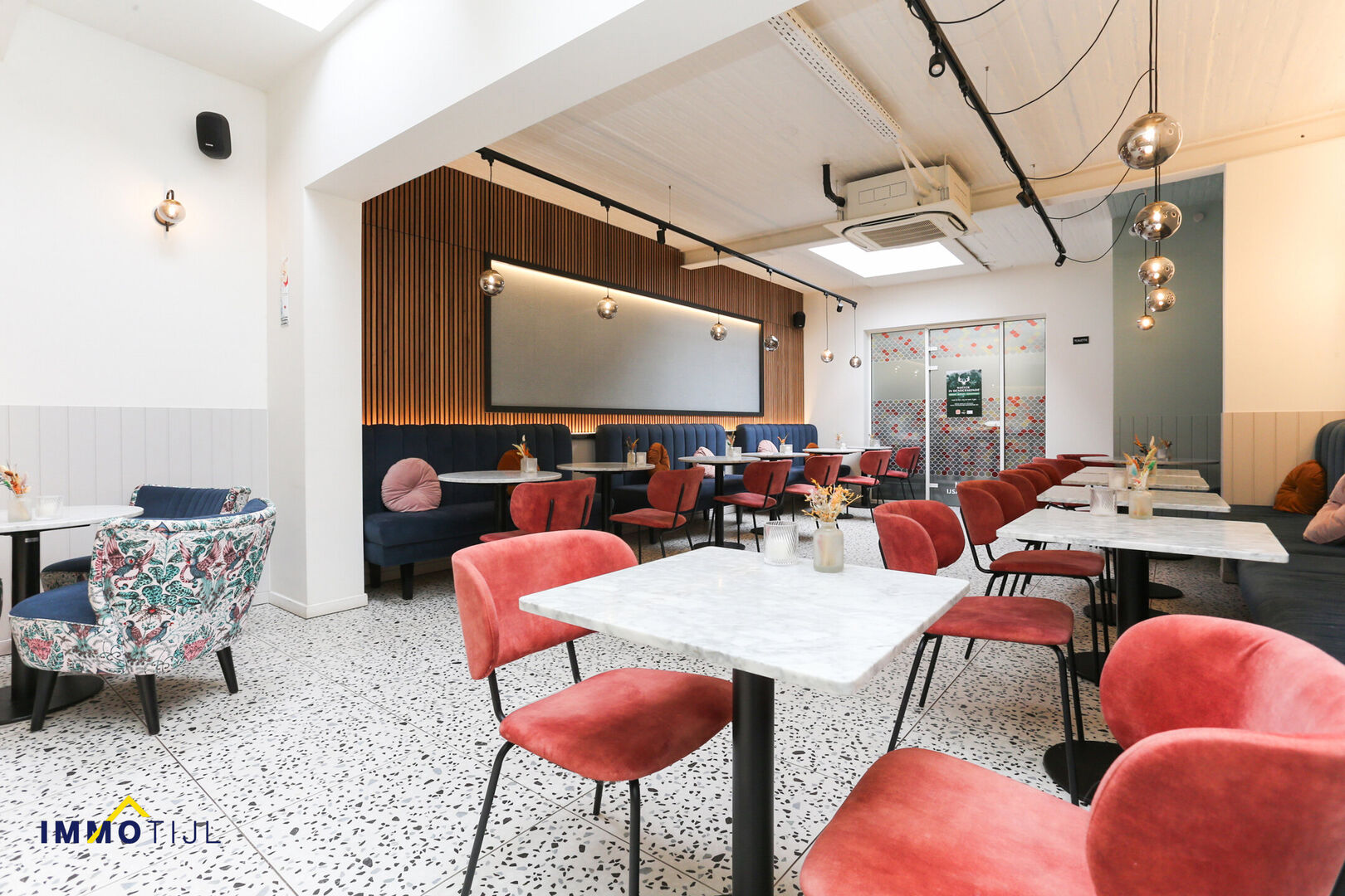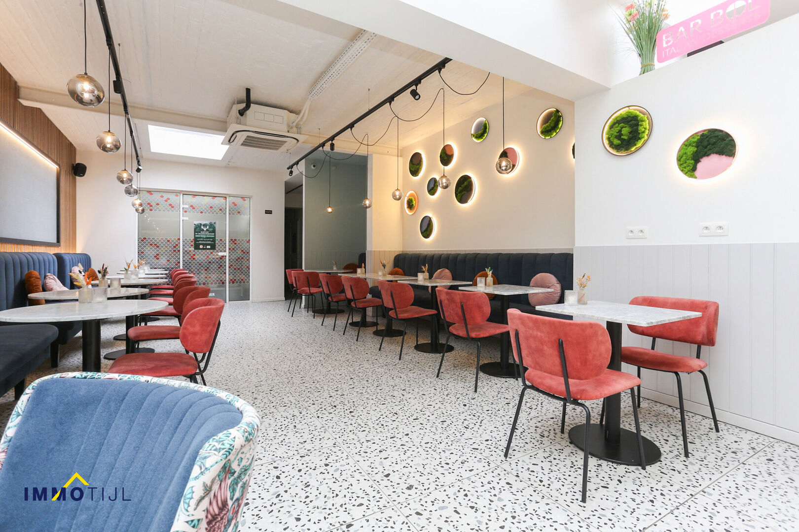 Bij het binnenkomen wordt u meteen verwelkomd in de ruime en aangename verbruikszaal met toog. Deze ruimte werd afgewerkt met hoogwaardige materialen, waaronder een trendy terrazzo vloer en stijlvol maatwerk, wat zorgt voor een warme en professionele uitstraling.
