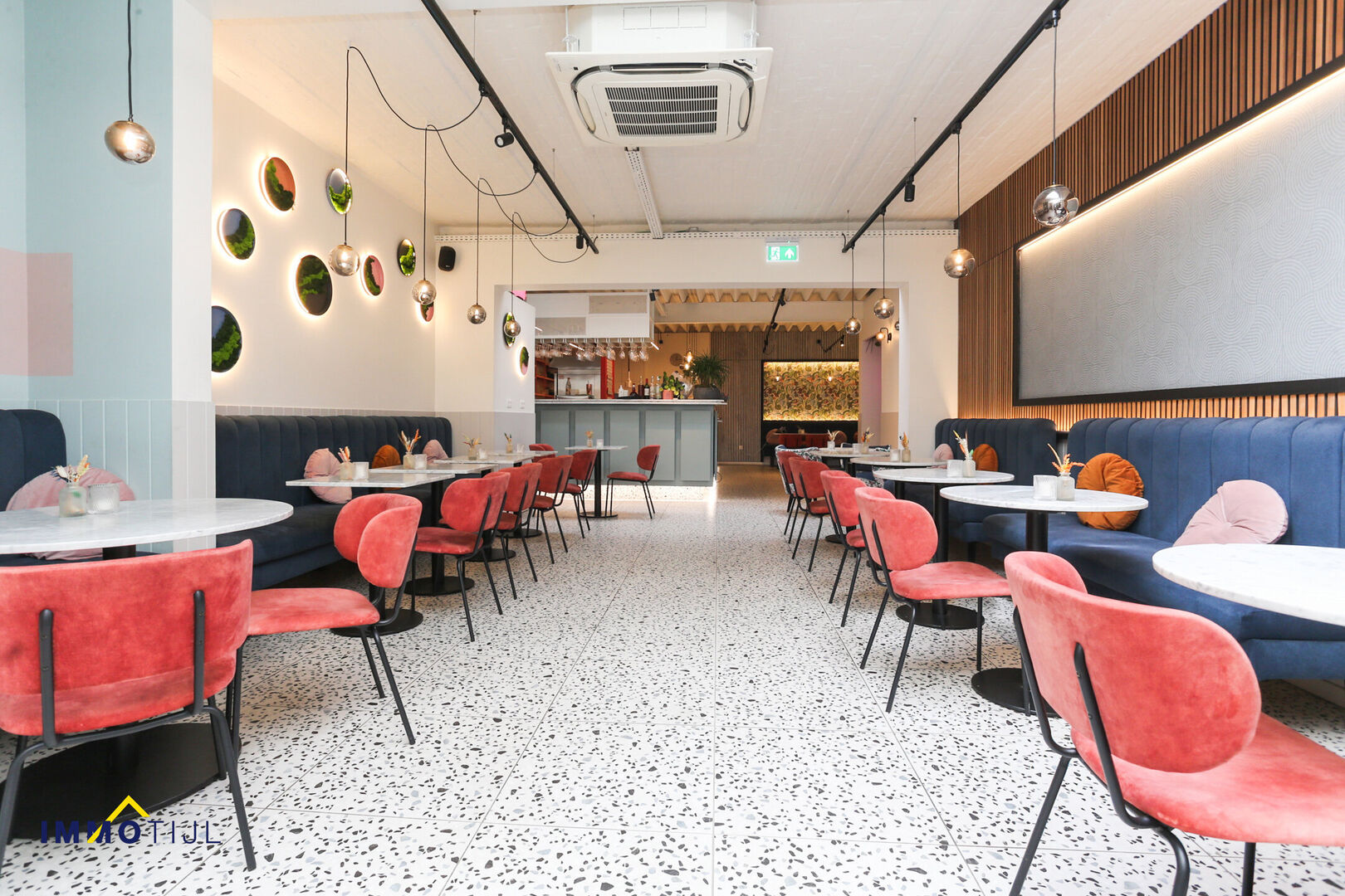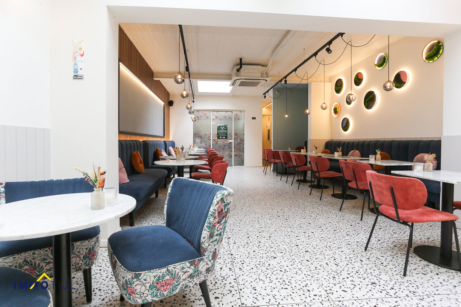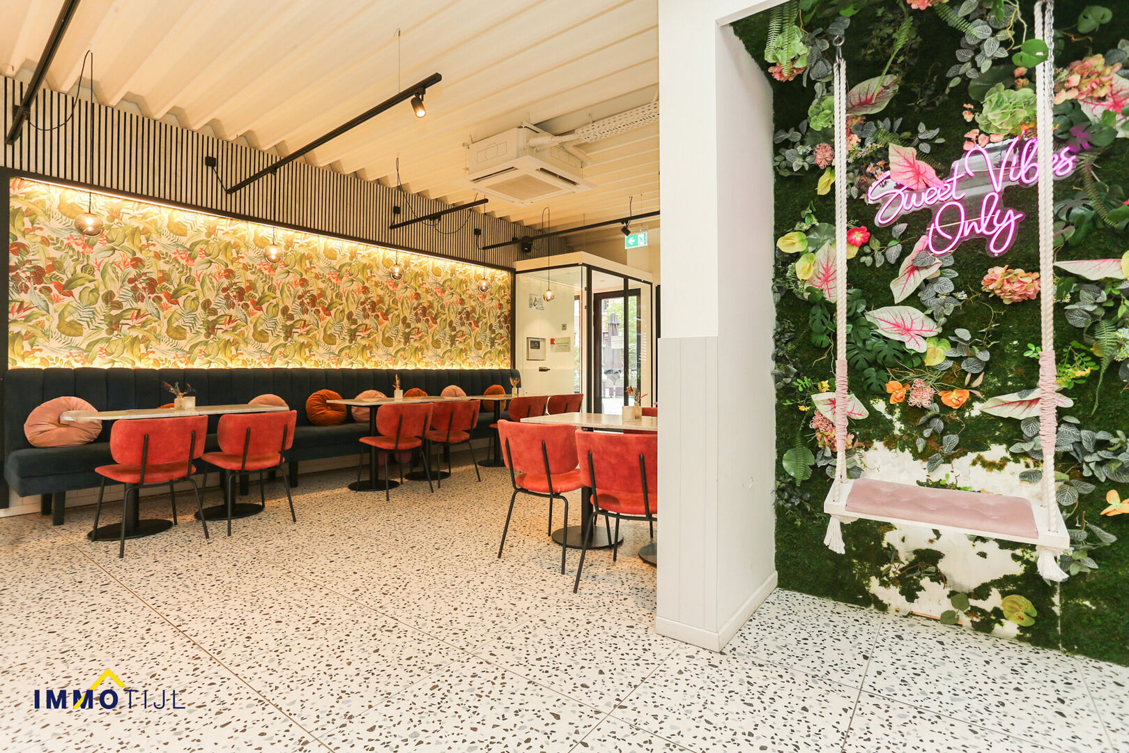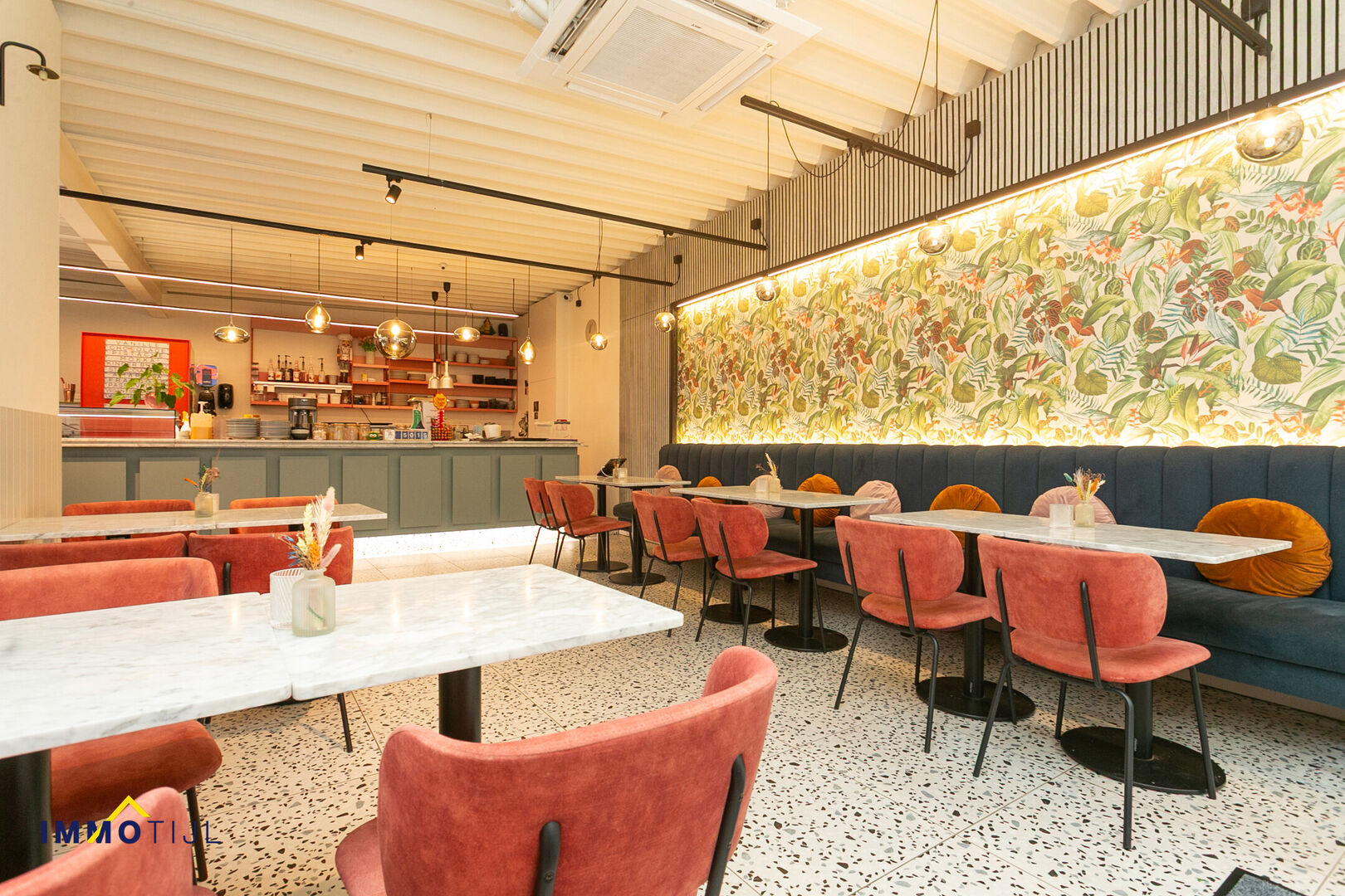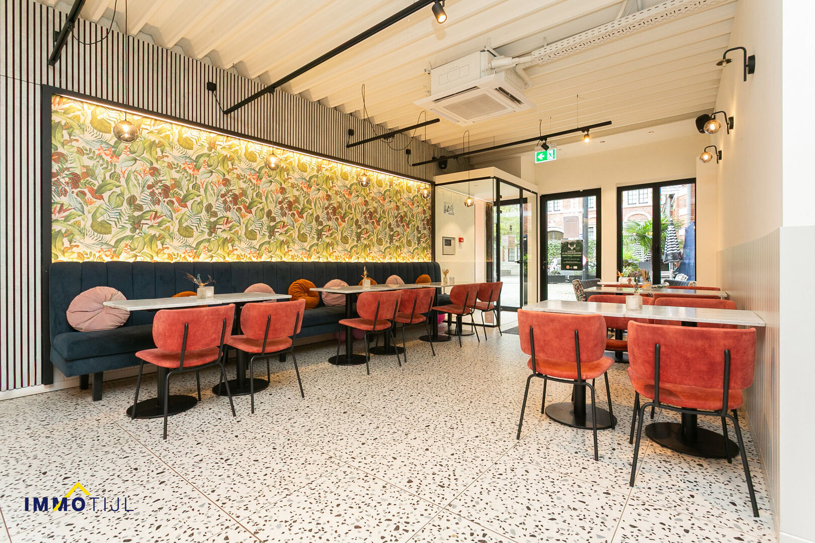 Bij het binnenkomen wordt u meteen verwelkomd in de ruime en aangename verbruikszaal met toog. Deze ruimte werd afgewerkt met hoogwaardige materialen, waaronder een trendy terrazzo vloer en stijlvol maatwerk, wat zorgt voor een warme en professionele uitstraling.