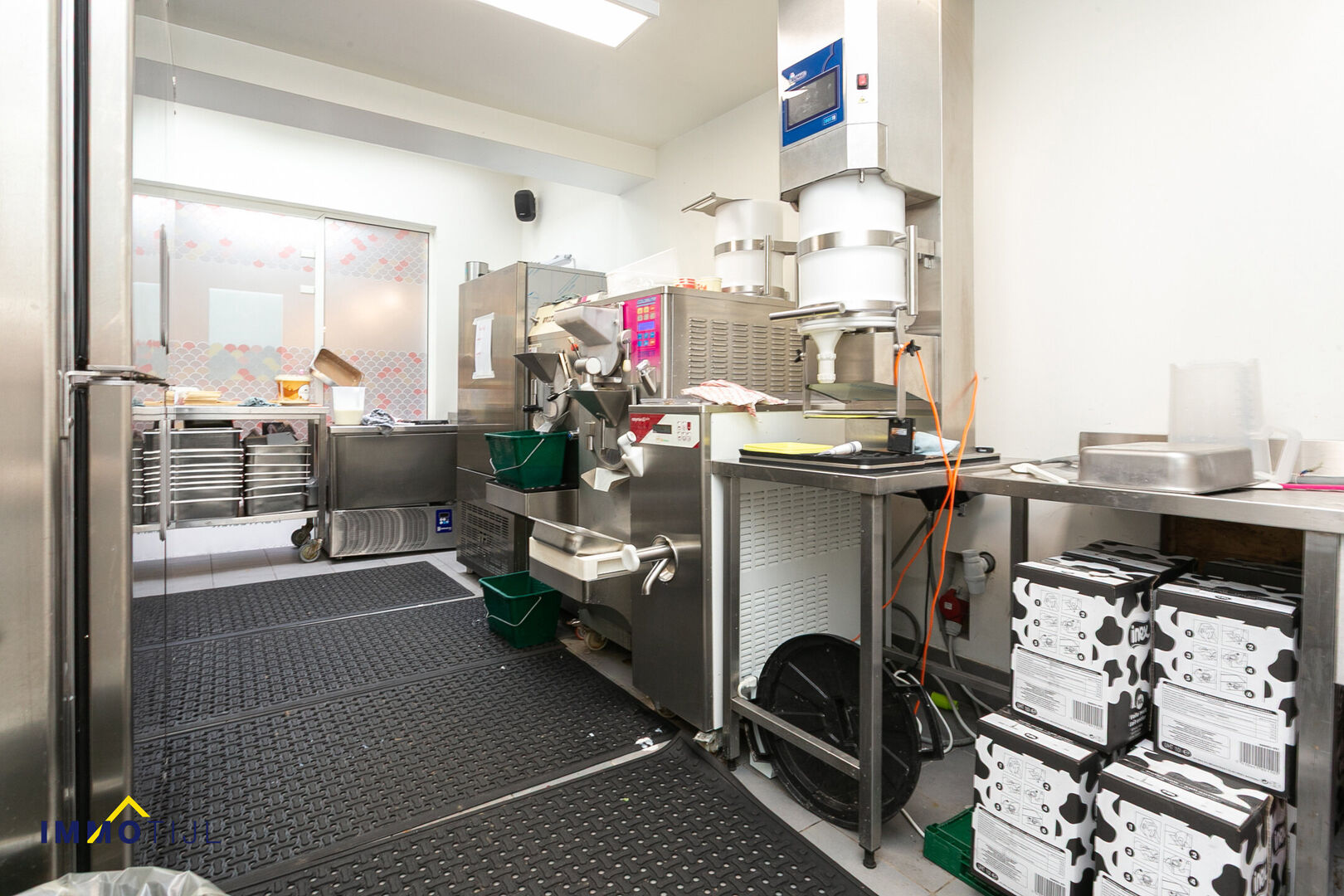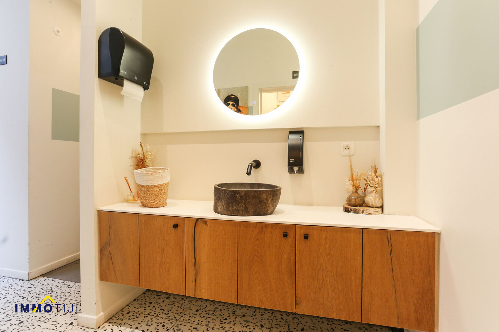 Aansluitend bevindt zich het sanitaire gedeelte. Daarnaast is er een afgesloten werkruimte met aanpalende stockage- en provisieruimte. Deze zone is bovendien ook bereikbaar via de achterzijde, langs de Oude Vest, wat praktisch is voor leveringen.