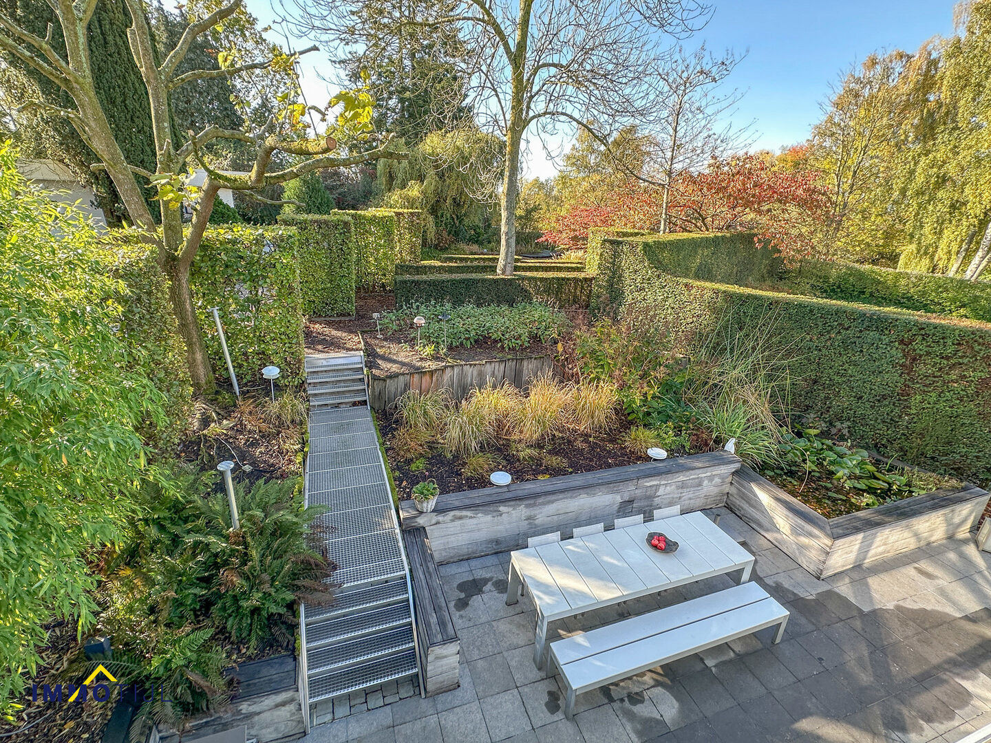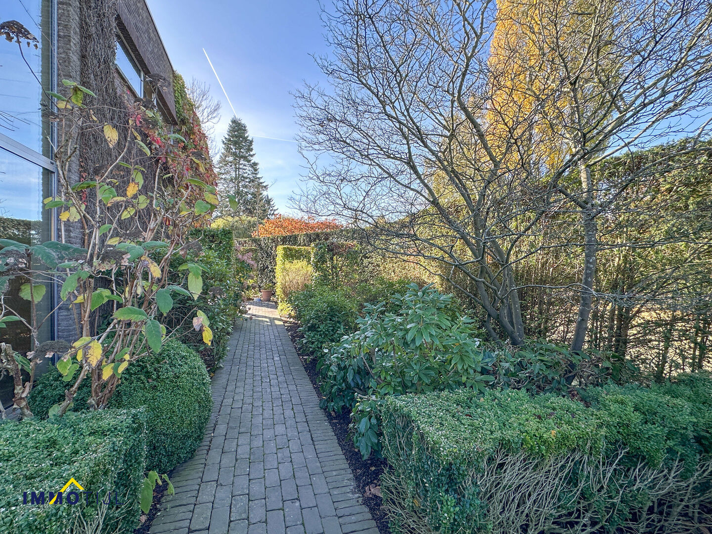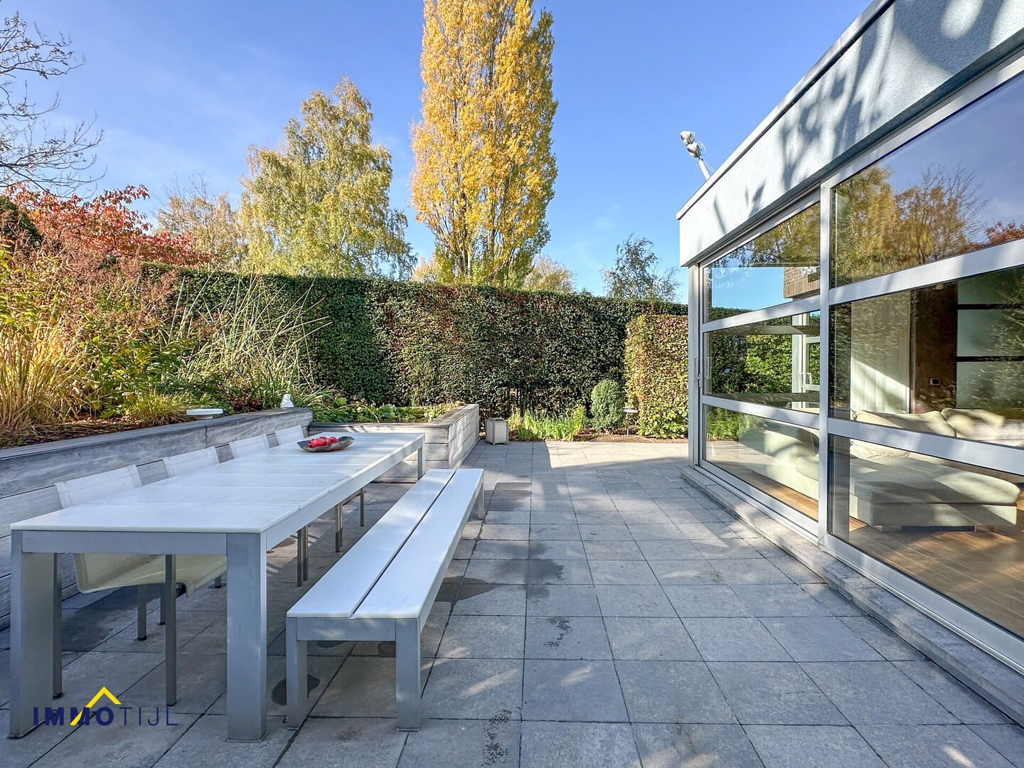 De grote raampartijen zorgen voor overvloedige lichtinval en creëren tegelijk een aangename connectie met de volledig aangelegde tuin - met ideale zuidwest oriëntatie - inclusief terras en siervijver.