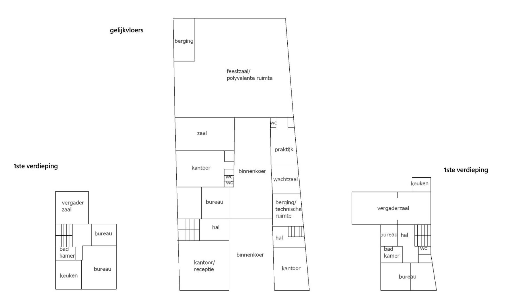 Op het gelijkvloers bevinden zich verschillende bureaus en polyvalente zalen, evenals sanitaire voorzieningen en een praktijk met wachtzaal. Via de binnenkoer heeft u vlotte toegang tot de feestzaal/polyvalente ruimte achteraan het gebouw.